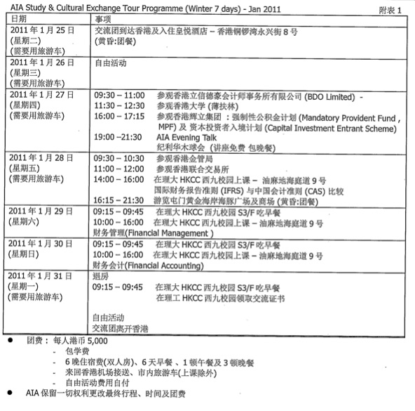 AIA(Association of International Accountants 国际会计师公会)香港分会为促进中港两地高等院校员工在国际会计、财务、管理方向的学习及文化交流,自2006年起开始主办《学术及文化交流项目》。具体信息可查询www.aiaworldwide.com,或到文荟楼底楼前台领取相关资料。 2011年1月该项的招募工作现已开始,具体行程安排请见Arrangement_201101。有兴趣的同学可在11月12日前填写Application Form,并将此表交到文荟楼402室张老师处。 活动组织方会根据报名人数进行筛选,最终名单在12月6日前公布。