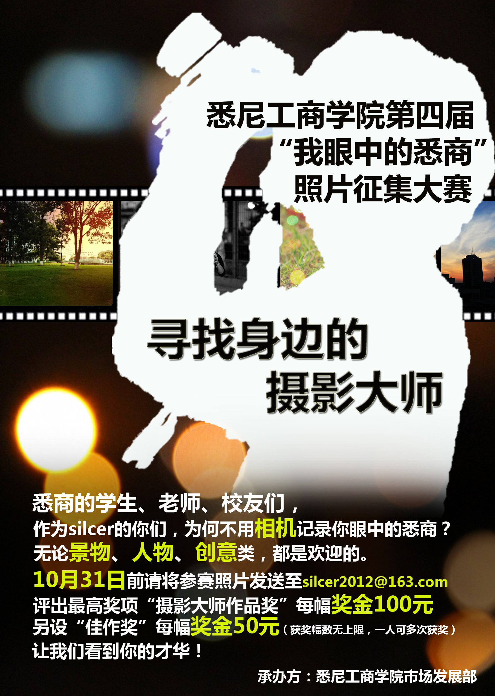 活动启动时间:10月15日 活动截止时间:10月31日 参赛对象:悉商的同学、老师、员工 奖项:"摄影大师作品奖"、"佳作奖" 投稿:请于10月31日前将摄影作品发至silcer2012@163.com (邮件中写清参赛人的信息) 承办方:yl23455永利市场发展部 |
