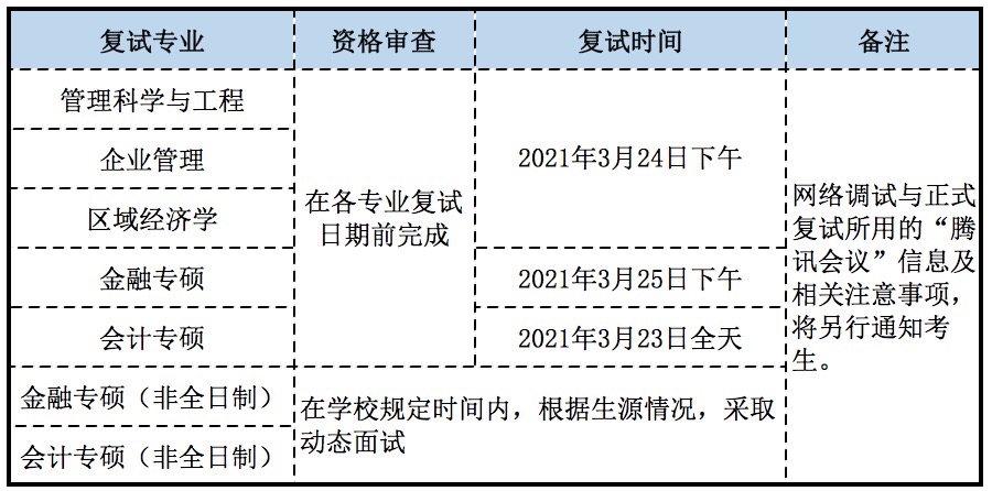 (备注:非全日制专业根据实际复试情况名额可能会有微调) 各专业复试分数线详见链接:https://yjszs.shu.edu.cn/info/1004/5501.htm 按照教育部文件要求,公司全面实施差额复试,原则上各专业的复试比例不低于1:1.2。 四、复试形式、时间 (1)复试形式 硕士研究生复试形式采取网络远程复试,不组织员工进校复试。复试工作人员及复试工作场所的疫情防控按照yl23455永利新冠肺炎疫情防控的相关规定执行。 公司采取“腾讯会议”远程会议系统、考生端“双机位”方式,具体要求及注意事项请以实际通知为准。 复试过程中,禁止考生录音、录像和录屏,禁止将相关信息泄露或公布;复试全程只允许考生一人在面试房间,禁止他人进出。若有违反,视同作弊。若遇网络故障等原因造成的突发状况,考生须立即联系公司复试工作人员,经招生工作领导小组审议后,根据情况进行缓考或重考。请保持本人联系手机的畅通。 (2)复试时间