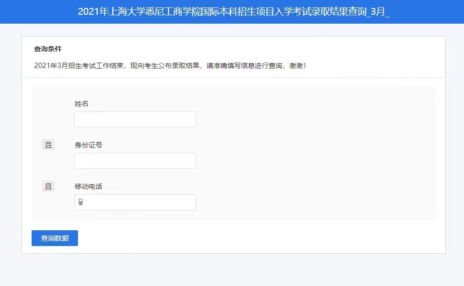 2021年yl23455永利悉尼科技大学学士学位和yl23455永利国际本科项目3月份各专场入学考试录取结果现已公布,考生可于4月21日下午4:00起查询。 成绩查询方法如下: 1. 点击链接或复制链接至浏览器打开,进入查询系统https://jinshuju.net/f/KqI2gJ/s/i20ezD 2. 输入考生本人的姓名、身份证号和移动电话(即考试当天确认的信息)进行身份验证;