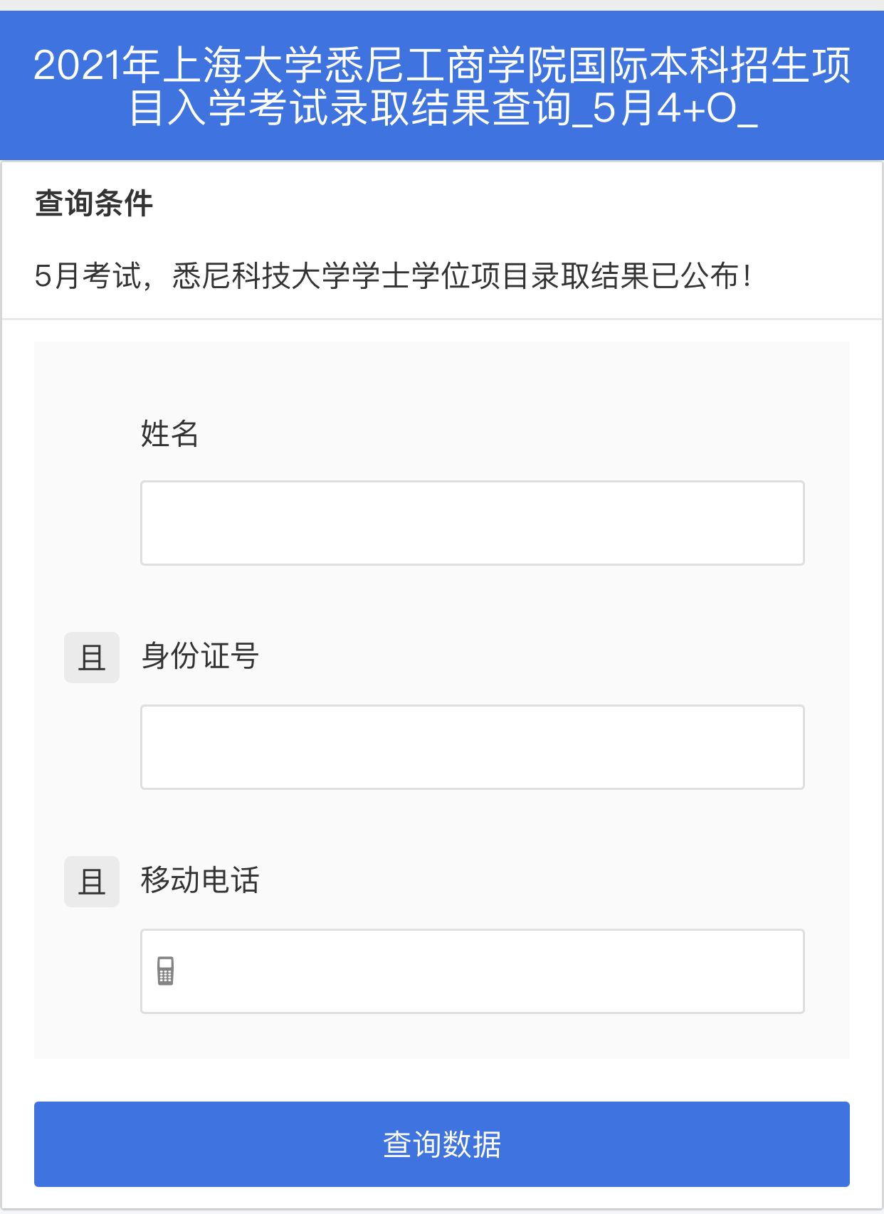 2021年yl23455永利悉尼科技大学学士学位项目5月各专场入学考试笔试成绩及结果现已公布,考生可于6月21日中午16:00起查询。 请本批获得面试资格的考生注意查收面试安排通知,按期进行面试预约! 成绩查询方法如下: 1. 点击链接或复制链接至浏览器打开,进入查询系统:https://jinshuju.net/f/At4wje/s/v6vOWt 2. 输入考生本人的姓名、身份证号和移动电话(即考试当天确认的信息)进行身份验证;