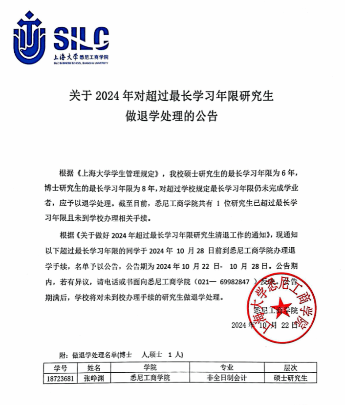 关于2024年对超过最长学习年限研究生做退学处理的公示
