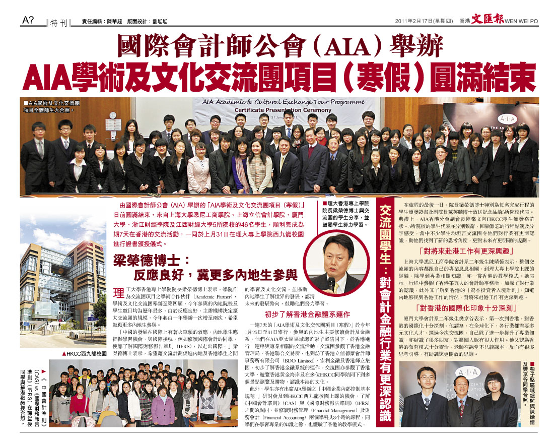 1月25日—31日寒假期间,公司员工代表队一行19人参加了国际会计师公会(AIA)举办的"AIA学术及文化交流团项目",在香港顺利完成为期7天的交流活动后于31日在理大专上公司西九龙校园举行的结业仪式上获颁证书。