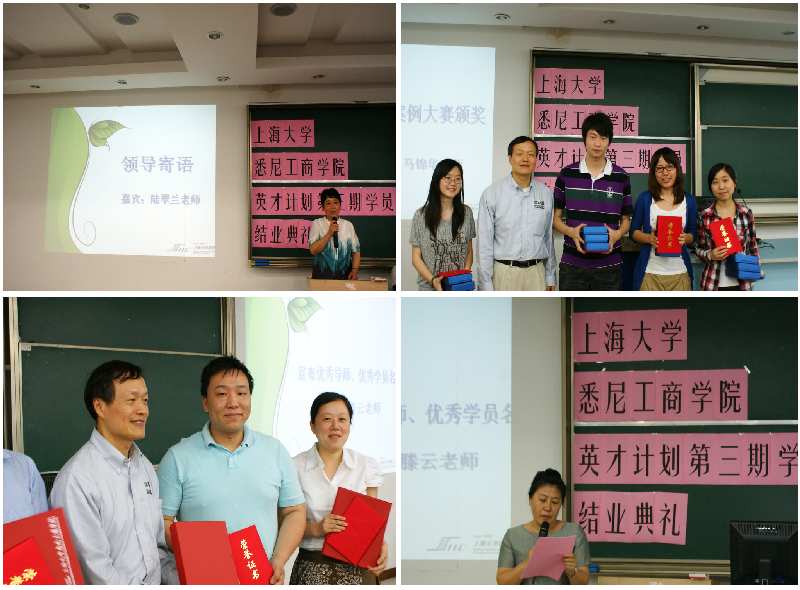 6月2日下午,"英才计划"第三期学员结业典礼暨悉商首届案例大赛颁奖典礼在实验楼报告厅隆重举行。公司党委书记陆翠兰、副书记滕云、副经理马锦华、经理助理胡笑寒和部分英才导师应邀出席结业和颁奖典礼,第三期英才学员和首届案例大赛参赛队员参加了此次活动。 负责"英才计划"具体实施的杨炼老师通过真实的数据、简练的语言以及一个精彩的视频回顾了过去一年英才计划的成长和发展,总结了英才指导老师和英才同学提出的一些反馈意见。随后副书记、"英才计划"项目总负责人滕云宣布第三期英才优秀导师和员工名单,副经理马锦华为获奖导师和学员代表颁发了荣誉证书和礼品;他应邀宣布首届悉商案例大赛评奖结果并为获奖参赛队颁奖,并鼓励英才学员继续积极参加各类竞赛活动。优秀导师代表方慧结合自身工作,分享如何借助英才平台促进师生共同进步;优秀学员代表李露滋则以朴实真诚的语言表达了她在"英才"的收获和感受,感谢"英才"的经历让她实现了被英国帝国理工大学录取之梦。