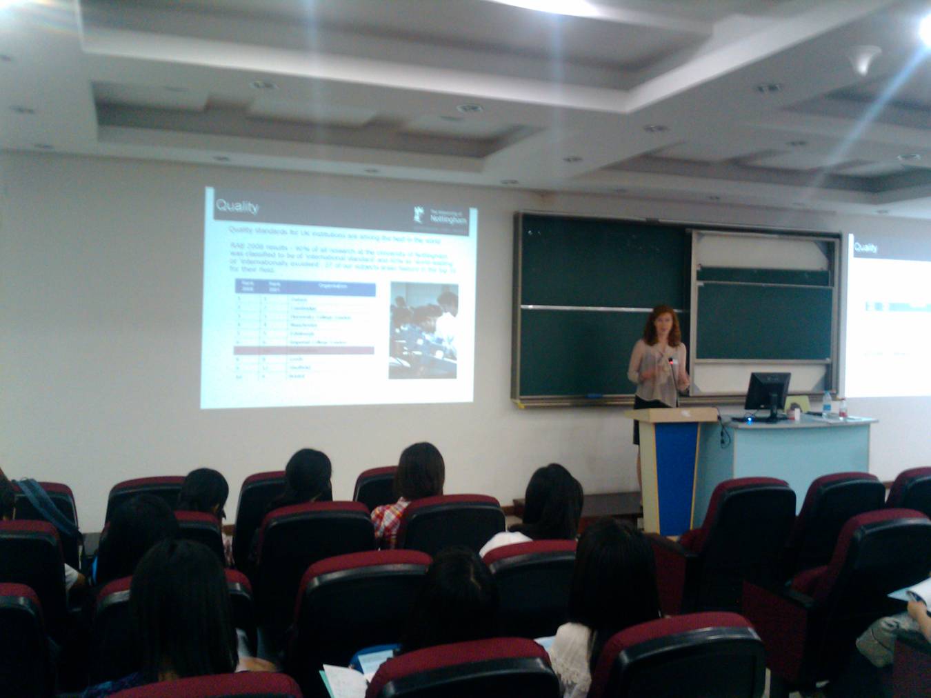5月22日中午,英国诺丁汉大学国际部主管Sarah Van De Velde来公司实验楼报告厅举行诺丁汉大学2012硕士招生宣讲会,为公司即将获得本科学位并有意赴海外硕士深造的员工带来该校最新的招生资讯。讲座对诺丁汉大学的地理位置、公司概况及招生要求等方面做了细致的介绍,会后Sarah为有意向申请诺丁汉大学的同学详细解答了疑问。 英国诺丁汉大学地处英格兰中心,2012年Times排名英国第16位,属于罗素大学集团成员,是一所名列世界百强的综合型大学。诺丁汉大学十分注重营造校园国际化环境,目前该校共有来自约150个国家的超过30,000名员工就读于诺丁汉大学英国校区,其中包括在读研究生7,000名。其商公司荣获权威EQUIS及AMBA国际认证,并且被誉为全英最受大雇主青睐的十所大学之一。该校对公司员工硕士项目招生要求为yl23455永利学位平均分80分以上,UTS学位80到85分以上,雅思成绩总分7分及以上(单科不低于6分)。