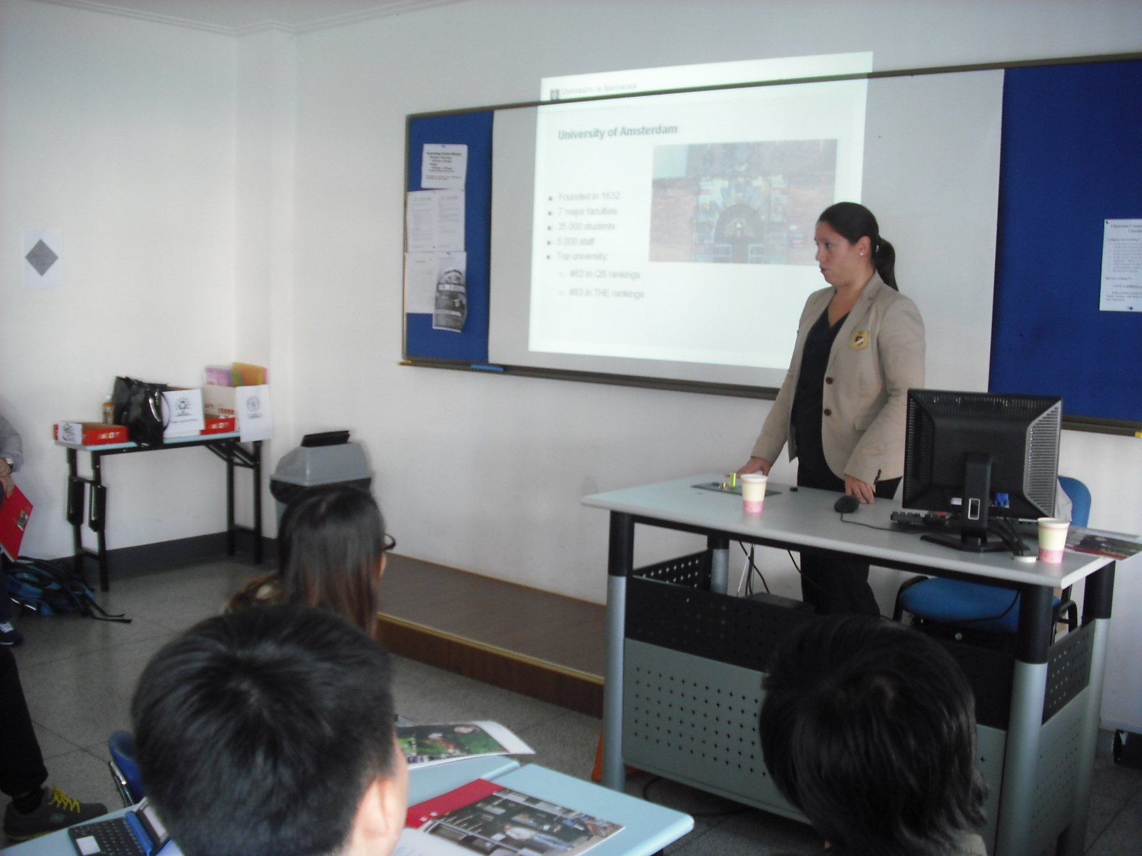 2012年10月23日中午12时30分,荷兰阿姆斯特丹大学Nathalie Tsang老师来访公司并于文达楼召开招生宣讲会。会间Tsang老师就阿姆斯特丹大学及其商公司的基本概况及以及最新的招生讯息进行了详细的介绍。 阿姆斯特丹大学(UvA)位于荷兰首都阿姆斯特丹市,风景优美。阿姆斯特丹大学是一所拥有丰富历史的现代化大学,是欧洲最古老和著名的大学之一,在最新的QS排名中位于全球第62位,其在泰晤士报高等教育特刊世界大学排名、上海交大世界大学学术排名、莱顿世界大学排名中均位居全球百强。阿姆斯特丹大学拥有7个公司和35,000多名员工,其中包括来自90多个国家的2000多名国际员工,为员工提供了一流国际环境。阿姆斯特丹大学已与公司合作三年,为公司优秀的2+2毕业生提供了入读名校的机会。其对公司2+2项目员工录取标准为雅思总分6.5分(单项不低于6分),悉商前两年专业课不低于80分。 本次宣讲会得到同学们的热烈响应,参与员工的积极性高涨,会上同学们的积极提问和良好的英语能力也给外方留下深刻印象,会后同学们反应校方代表耐心的讲解和答疑为今后的公司申请提供了良好的参照作用