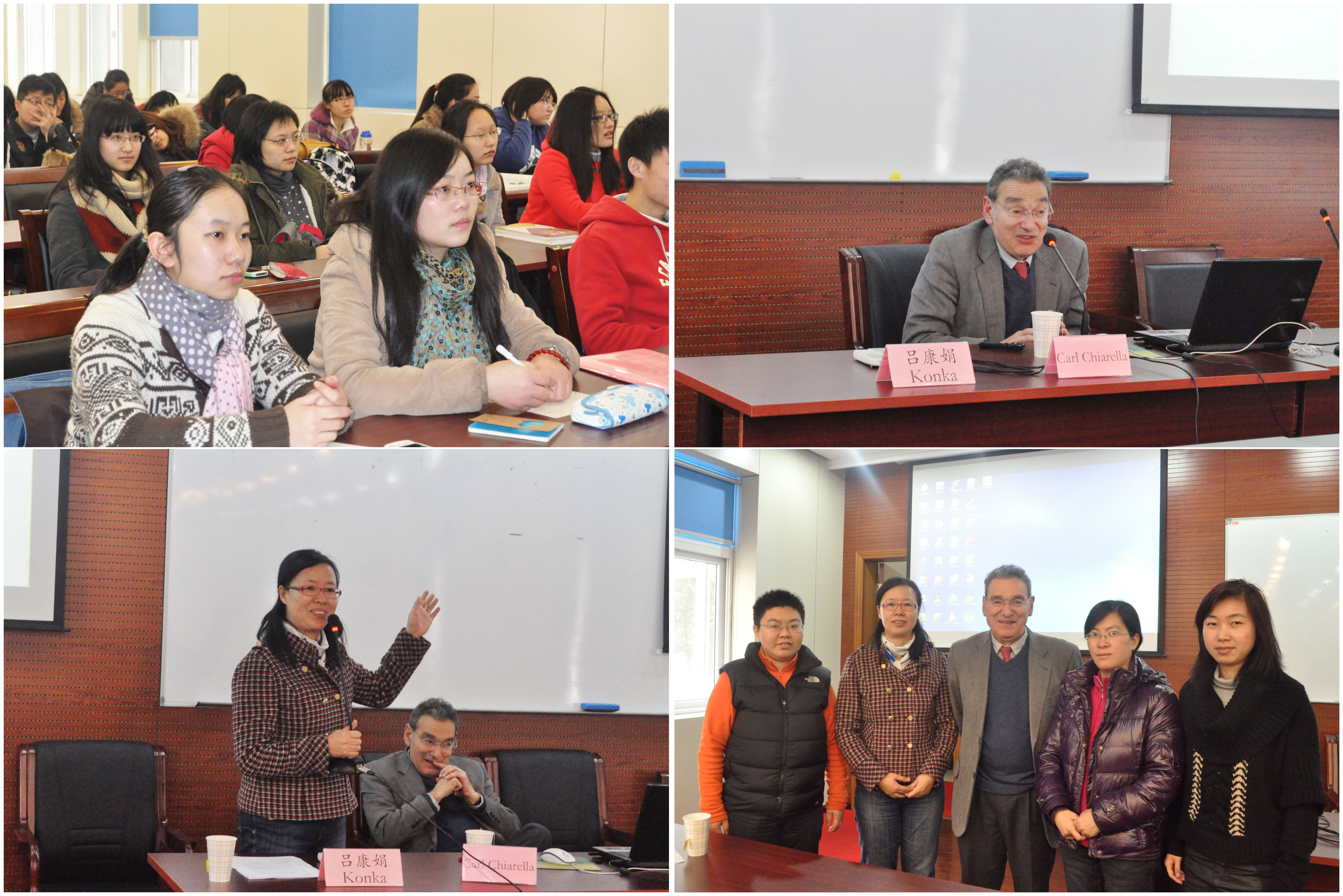 Carl教授讲了商品期货的鸿沟的随机波动率的模型、原油市场和数据、扩展的卡尔曼滤波估计、结果与驼峰状波动性功能。比如原油价格波动突然上涨的问题,他使用了资产定量模型,广义定义飞跨期货行为,指明期货不能使用期权,分析了随机波动的因素。用商品的鸿沟随机波动模型与罗斯福下一定的波动性规格模型、 HJM 模型、原油市场波动具有的不同形状、 组合以及驼峰形和指数衰减模型解释同期多因素跳跃式发展。并说明今后的研究方向:比较嵌套的模型;带跳跃的模型研究和估计波动在不同的市场,如天然气、 黄金等。 在互动交流环节,Carl教授与各位老师同学进行了深度的探讨,对于期货的模型和未来的发展为同学老师们释疑并进行研究指导,使大家受益匪浅。(科研部)