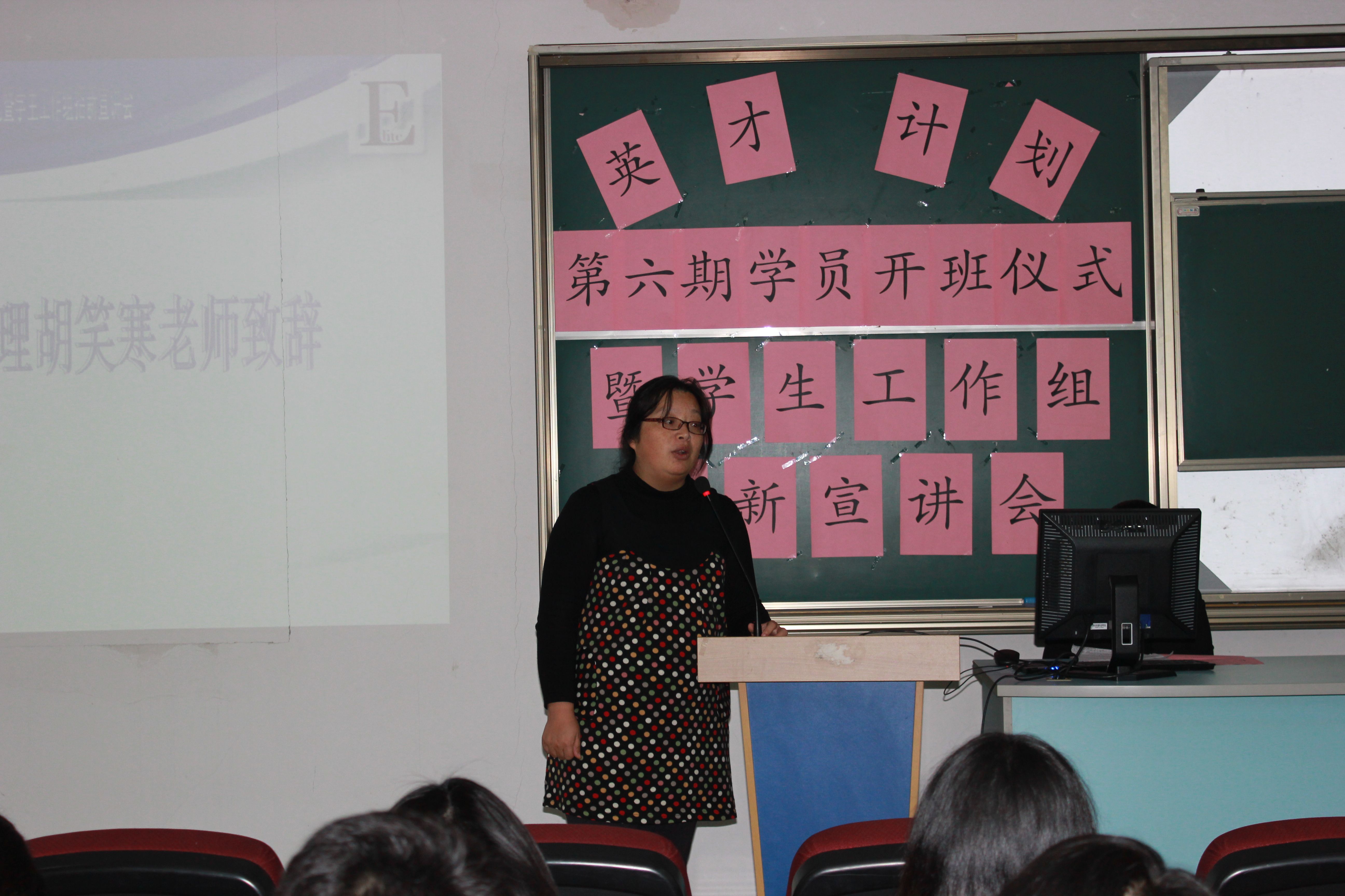 英才员工工作组组长袁梦霖同学总结了"英才计划"上一年度的主要活动情况,"暖冬之旅"和案例大赛两次大型集体活动令全体新学员对未来一年的新活动方案充满期待。11级国际经济与贸易专业的张任飞同学作为第六期学员的代表发表了声情并茂的演讲,她从自身情况和对"英才计划"的感受出发,表达了对加入"英才"后的憧憬和自己立志成才的决心。张同学别具匠心的对"Elite(英才)"一词的新解博得了在场师生的共鸣。她指出该词的五个英文字母分别对应exploration(探索)、language capability(语言能力)、international capability(国际化能力)、transformation capability(转化能力)和Endeavour(努力),代表着优秀的英才学员、乃至杰出老员工都应具备的个人能力与素质。 胡笑寒老师就如何珍惜"英才"机遇提升专业能力分享了自己的感受,她表示理论研究类、行业调研类、竞赛类、助教类、设计开发类的项目都要求学员用心付出,但导师的要求和指导方式可能不同,学员不应过于在意项目类型的不同而限制自身进步。胡老师指出"英才计划"的培养总是以实现知识传递和能力提升为目标,帮助学员逐步养成观察、协作、主动学习和个人规划等能力,希望学员珍惜"英才"培养过程中的成长经历,从而实现个人的可持续发展。