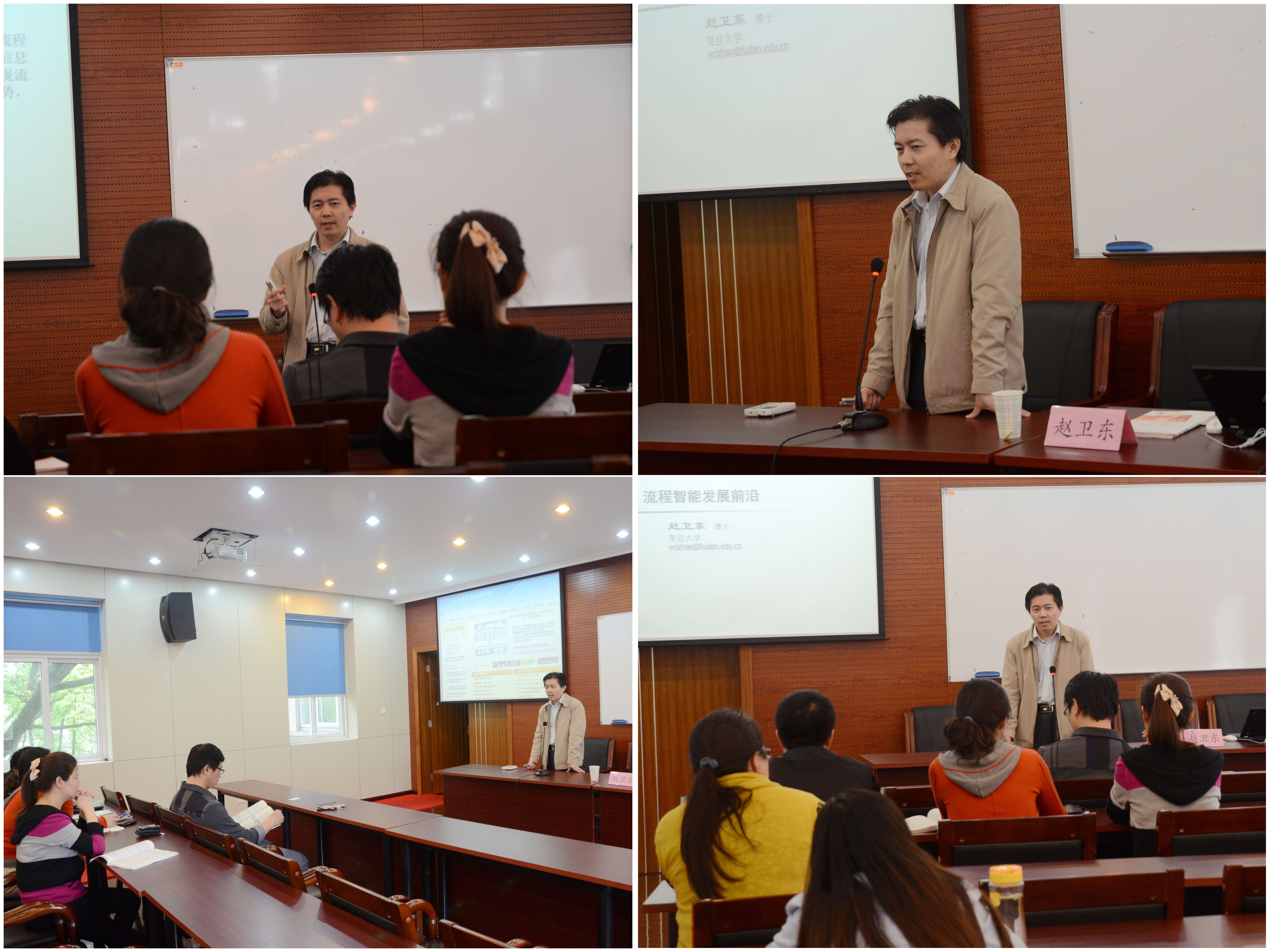 5月17日下午,东南大学博士、复旦大学博士后赵卫东应邀在文德楼三楼报告厅做了题为 "Frontier of Process Intelligence流程智能前沿"的讲座。 赵卫东博士自2005年起研究流程智能化,在重要刊物和国际学术会议上发表学术论文80多篇,所负责的商务智能课程被评为教育部-IBM精品课程和上海市精品课程。赵老师通过列举多个实际案例,讲解流程智能化在各个行业中的重要用途。他首先对流程智能化的概念和发展历程做了简要回顾,而后介绍了流程智能化的研究内容及应用案例。讲座内容深入浅出,生动形象,现场氛围轻松活跃。 参加讲座的师生来自各个不同专业,他们围绕赵卫东博士的讲座内容进行了热烈的讨论,提出对流程智能化的见解,并就不理解的地方向赵卫东博士提问。赵卫东博士进行了详尽的解答。最后吕康娟副经理总结了讲座的核心内容,并向赵卫东博士的细心讲解表了感谢。员工们表示,这次讲座的内容使他们对于流程智能化这个较新的课题有了更深入的了解,对他们更好地学习、理解课程内容颇有触类旁通的启发作用。(科研部)