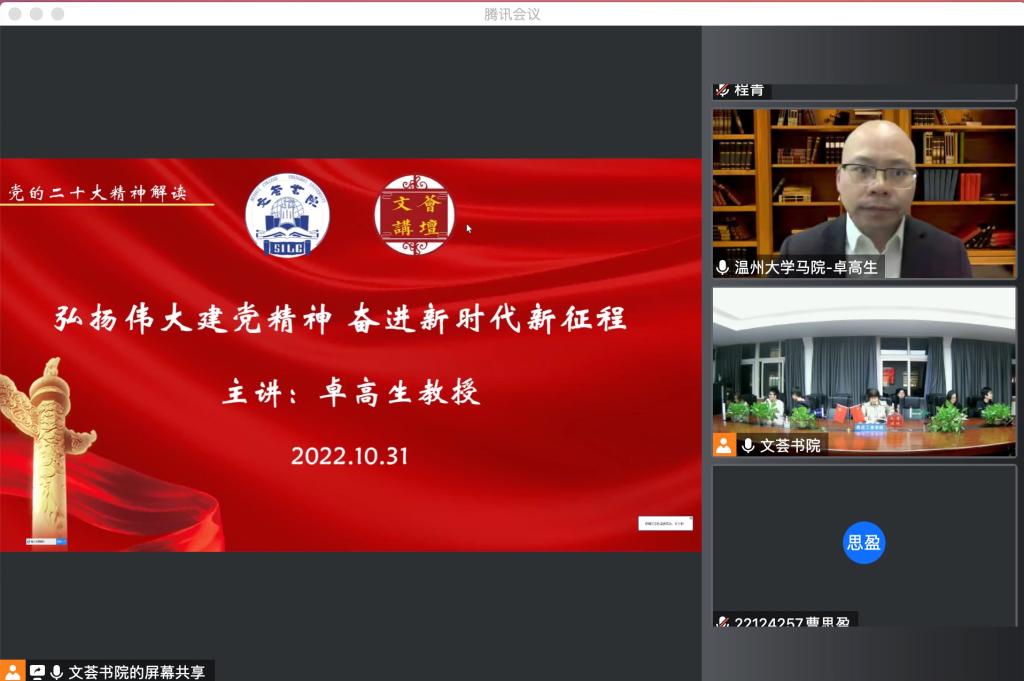 10月31日晚,文荟书院2022-2023学年文荟讲坛第一讲邀请温州大学马克思主义公司经理、博导卓高生教授以“弘扬伟大建党精神 奋进新时代新征程”为主题解读二十大精神。讲坛由悉商公司党委副书记、副经理、文荟书院执行经理卫静芬主持,公司党政领导班子、中心组成员、教职工党员代表、员工党员及入党积极分子等聆听了报告。 卓高生教授从yl23455永利的渊源为开端,徐徐展现了党的辉煌百年奋斗史,作为中国共产党创办的第一个“红色学府”,yl23455永利百年的发展奋斗历程,始终与中国共产党的“初心”同频共振,是中国最早系统化地向员工传播马列主义思想理论的高校。一个半小时的讲座中,卓教授分享了他对二十大精神悟、透、学的成果,全面深刻地解读了二十大报告的核心内容。他指出,二十大报告框架体现和围绕了过去五年的工作和新时代十年的伟大变革;开辟了马克思主义中国化时代化新境界;新时代新征程中国共产党的使命任务;实施科教兴国战略、强化现代化建设人才支撑的深远意义;“三个务必”的深刻内涵和重大意义;中国式现代化的开创性意义;加快构建新发展格局、着力推动高质量发展等。