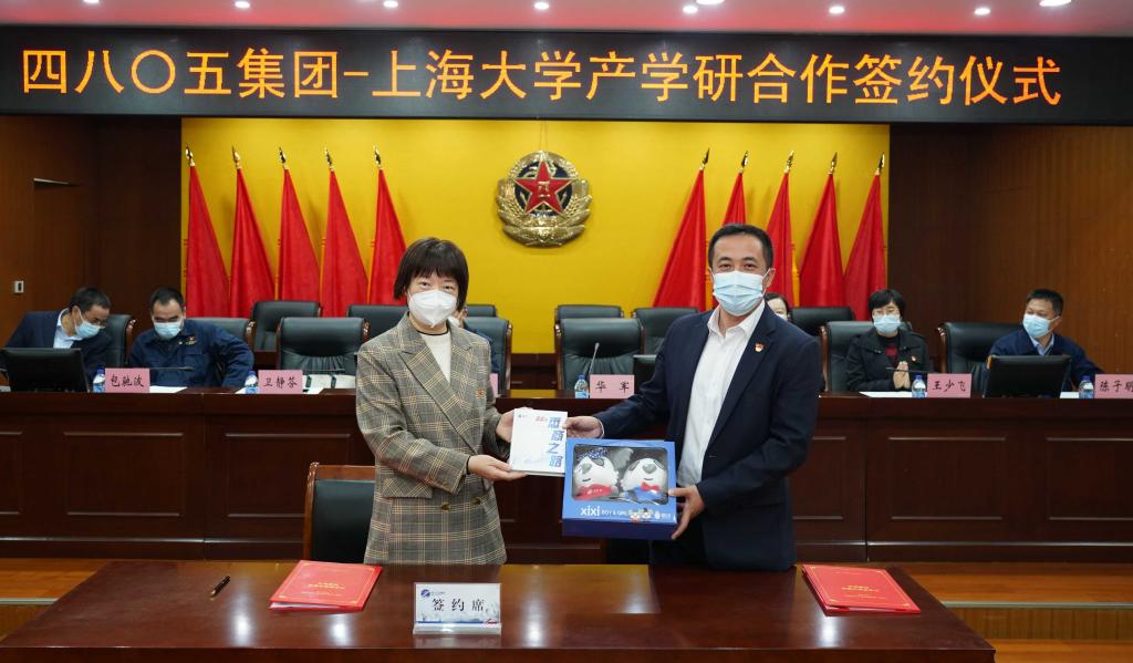 卫静芬副书记代表公司向四八〇五集团赠送了公司吉祥物和总结上大悉商建院25年来办学历程和特色经验的专著《悉商之路》。
