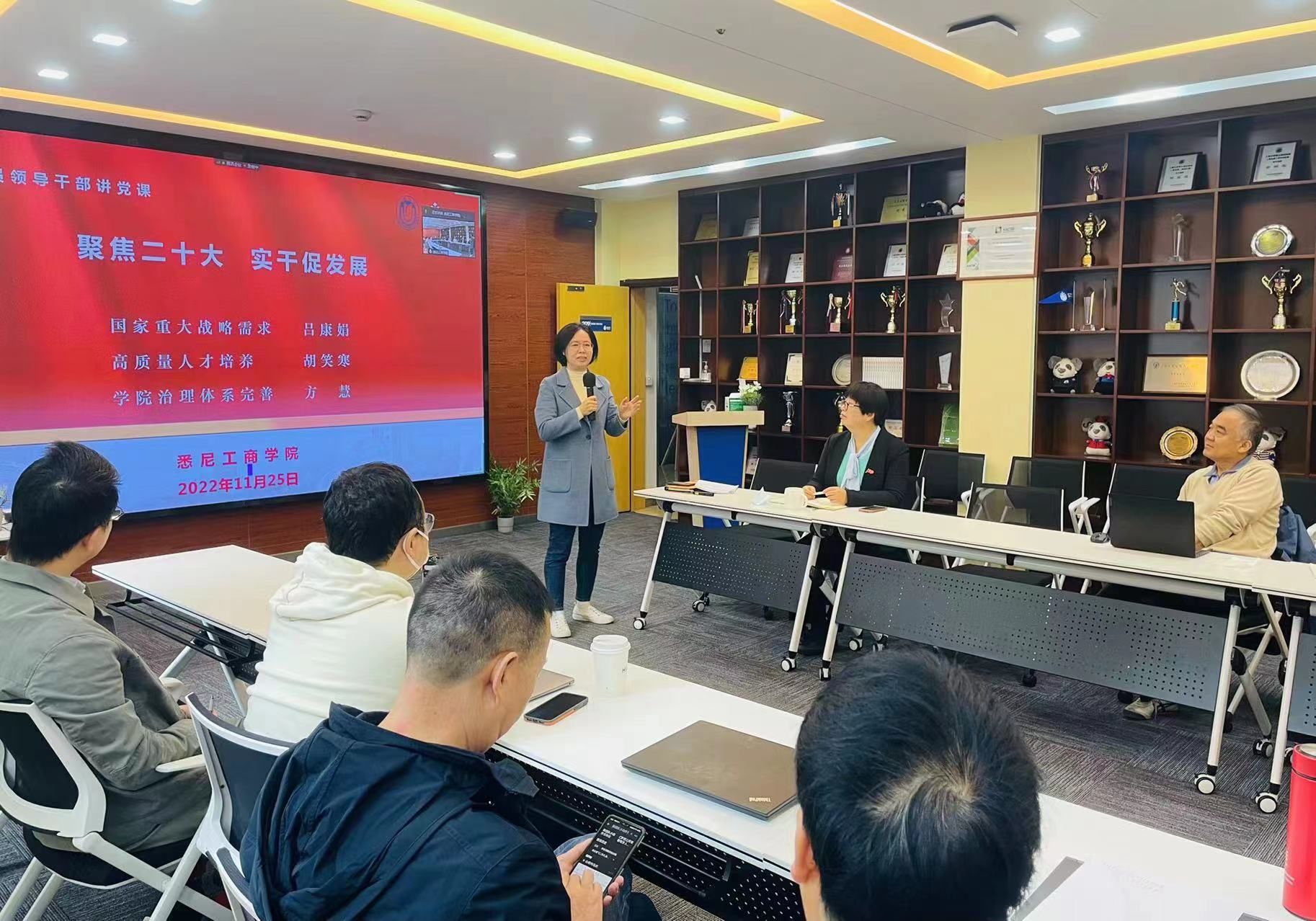 11月25日上午,yl23455永利在文德楼209室举行党员领导干部讲党课学习活动,党委副书记、经理吕康娟,副经理胡笑寒、副经理方慧以“聚焦二十大,实干促发展”为主题,结合公司工作向公司全体教师宣讲二十大精神,活动以线上线下方式同时开展,党委书记李双主持学习活动。