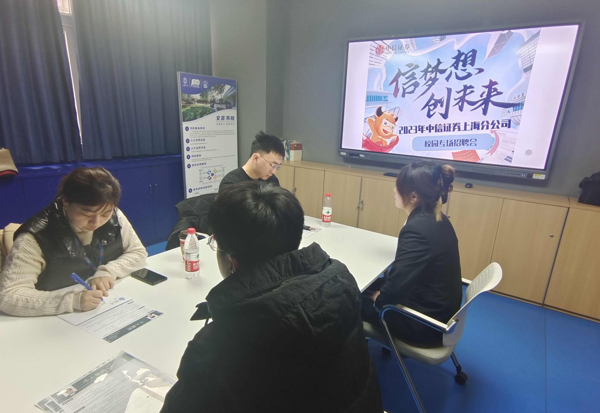 专场面试在文博楼106举行。中信证券上海分公司和三个营业部的领导们亲自为近20名悉商学子进行了一对一的面试。通过面试的同学今年3月就可陆续入职。 通过此次校园招聘会,悉商学子们对中信证券强大的专业团队,成长共赢的企业文化以及全面系统的新人培养制度有了更深入的了解。笃行方致远,成长不设限。中信证券为每一位入职员工提供广阔的发展空间与全球化关系网。本次活动让同学们了解到了一个更为全面的中信证券,在这里也衷心预祝参与面试的同学能够斩获自己心仪的offer,春暖花开,信梦想,创未来。 |