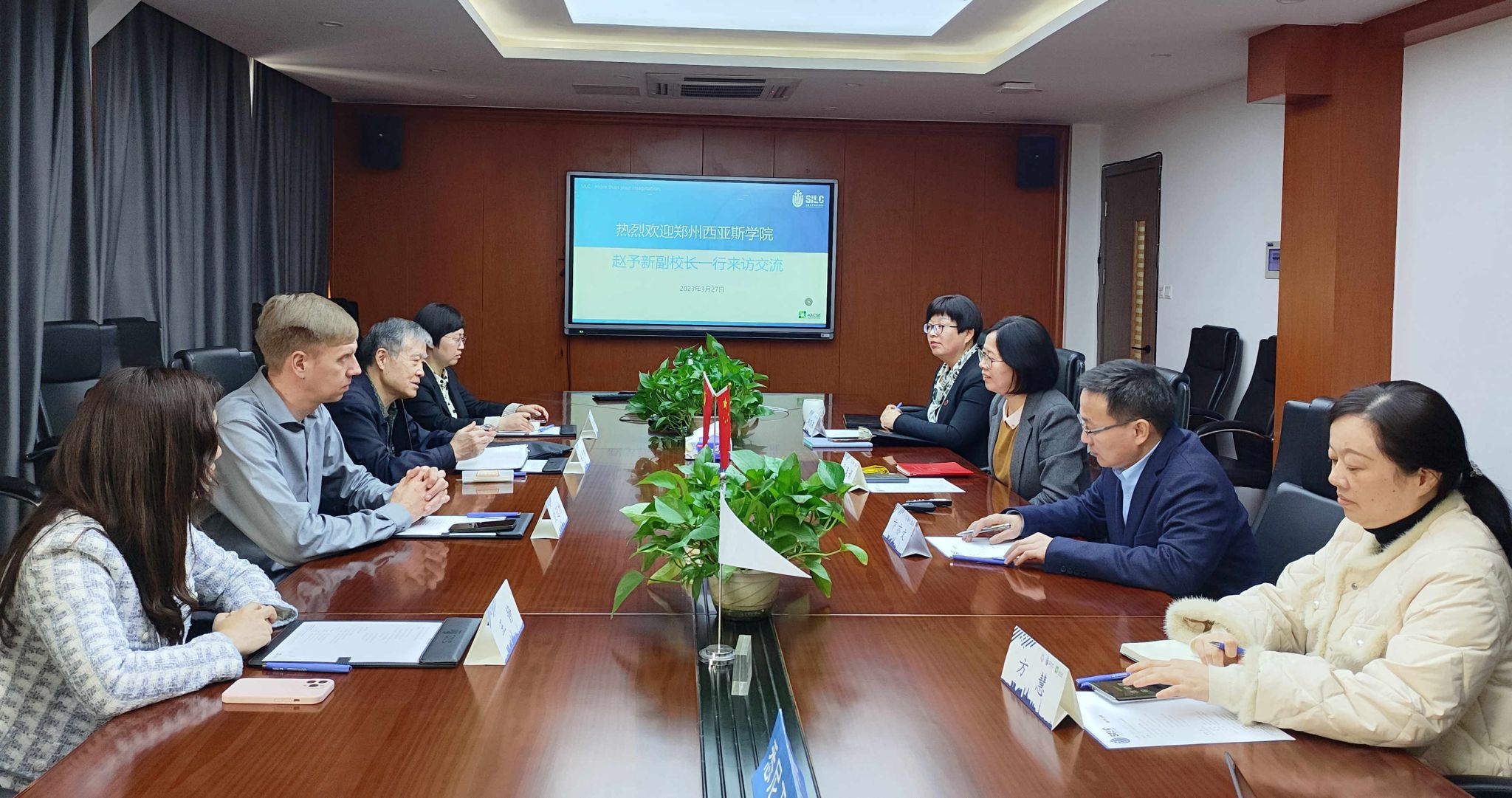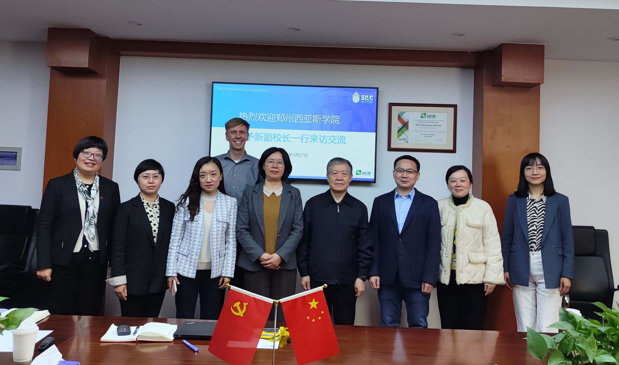 3月27日下午,郑州西亚斯公司副董事长赵予新率教务处处长助理陈静、堪萨斯国际公司外方经理沈迈特、中方经理王静一行四人来院调研访问,会议在文荟楼409室举行,公司党委书记吕康娟、经理卞亦文、副经理胡笑寒、方慧,院国际部副主任孟瑞琼参加会议。