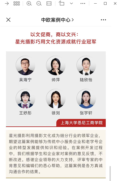 近日,“2022中国工商管理国际最佳案例奖”揭晓,悉商官商管理系教师吴海宁、帅萍领衔,带领陆欣怡、王妤彤、徐刘、张宇轩等四名在读本科生共同撰写的题为“以文促商,商以文兴:星光摄影巧用文化资源成就行业冠军”的案例荣获二等奖。