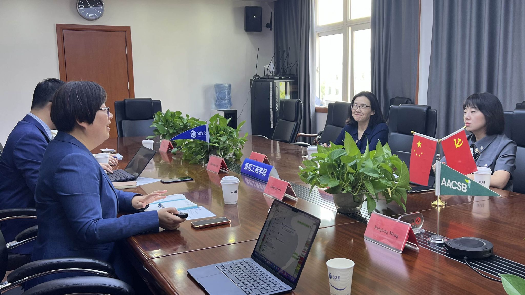 4月17日下午,英国拉夫堡大学国际合作交流部项目经理Lu Bai, 商公司会计财务组副组长、会计与金融高级讲师Lei Chen来院交流访问。公司副经理胡笑寒、国际部主任顾浩东、国际部副主任孟瑞琼、财会系讲师陆叶与来宾在文荟楼409会议室举行会谈。