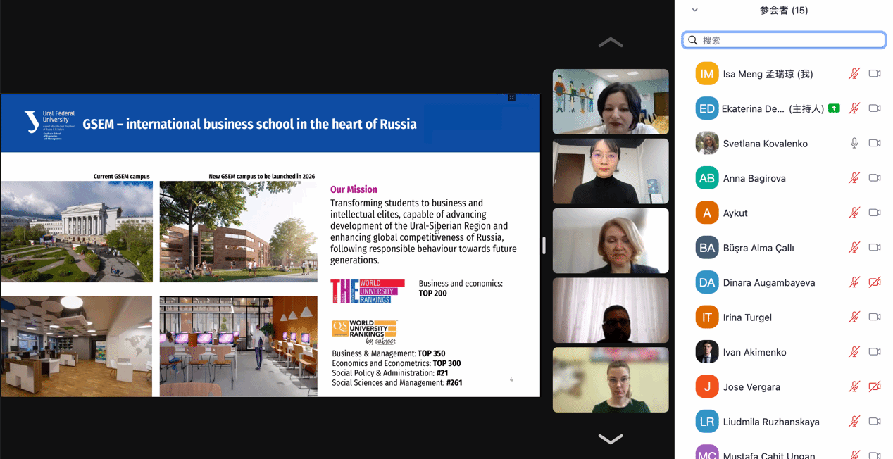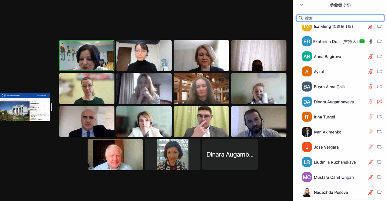4月18日-4月20日,乌拉尔联邦大学经济与管理公司的国际伙伴日活动线上开启。来自中国、印度、摩洛哥、马来西亚、土耳其、阿尔及利亚、韩国、俄罗斯等国的大学代表参会。公司经金系计志英、李瑜敏、陈军,国际部顾浩东、孟瑞琼、刘方、唐定强、诸晓秋等参加会议。