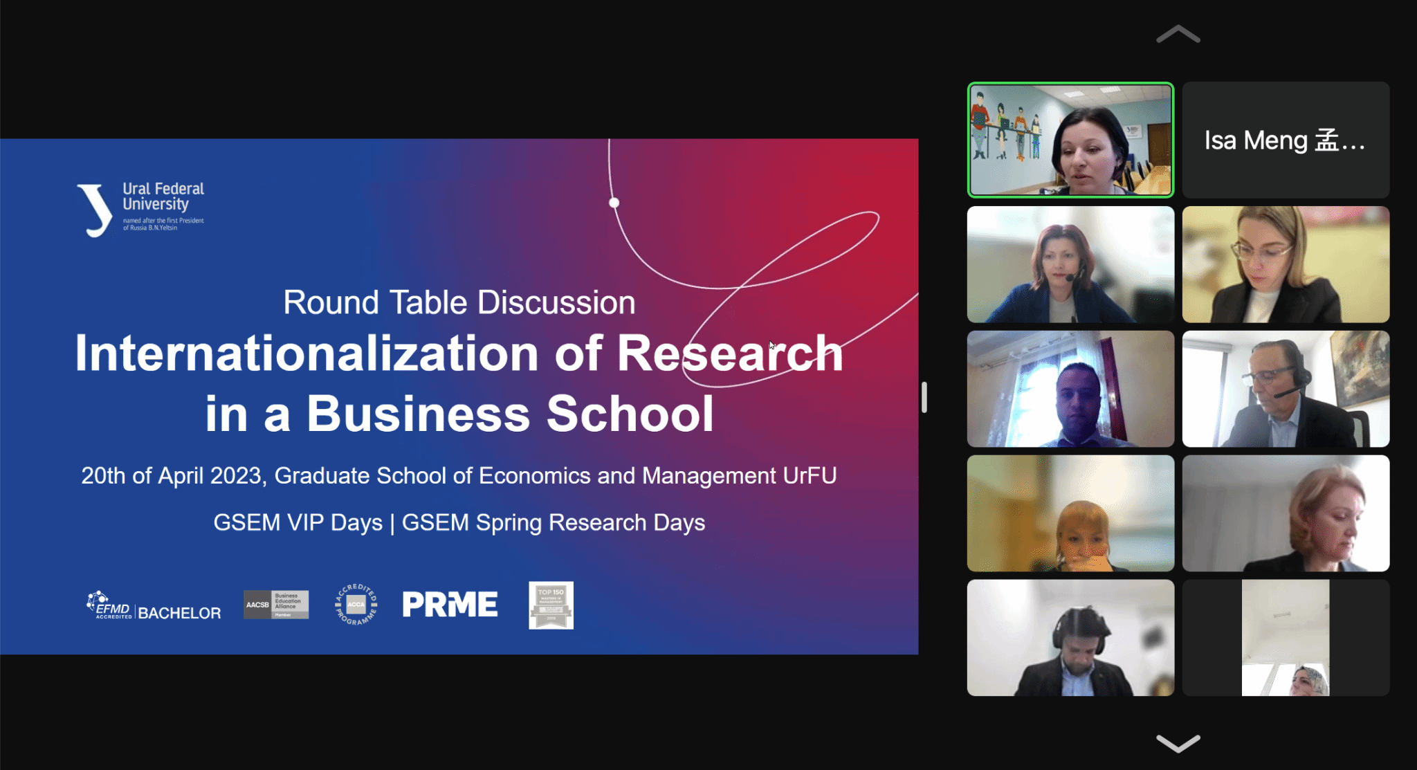 活动第二天,顾浩东和唐定强与乌拉尔联合大学经济与管理公司的相关院系负责人在线上会面,就师生交换、联合科研、短期项目等合作意向进行了深入探讨,并交换了双方意见。 活动第三天,计志英副教授、李瑜敏副教授和陈军博士代表公司参加了主题为“商公司科研国际化”的圆桌论坛,与来自俄罗斯乌拉尔联合大学(Ural Federal University )、中国西南财经大学(Southwestern University of Finance and Economics) 、马来西亚玛拉工艺大学(University Technology Mara、摩洛哥ESCA大学(ESCA Ecole de Management)、印度对外贸易研究所 (Indian Institute of Foreign Trade)的教授共同探讨大学科研国际合作的方式和路径。