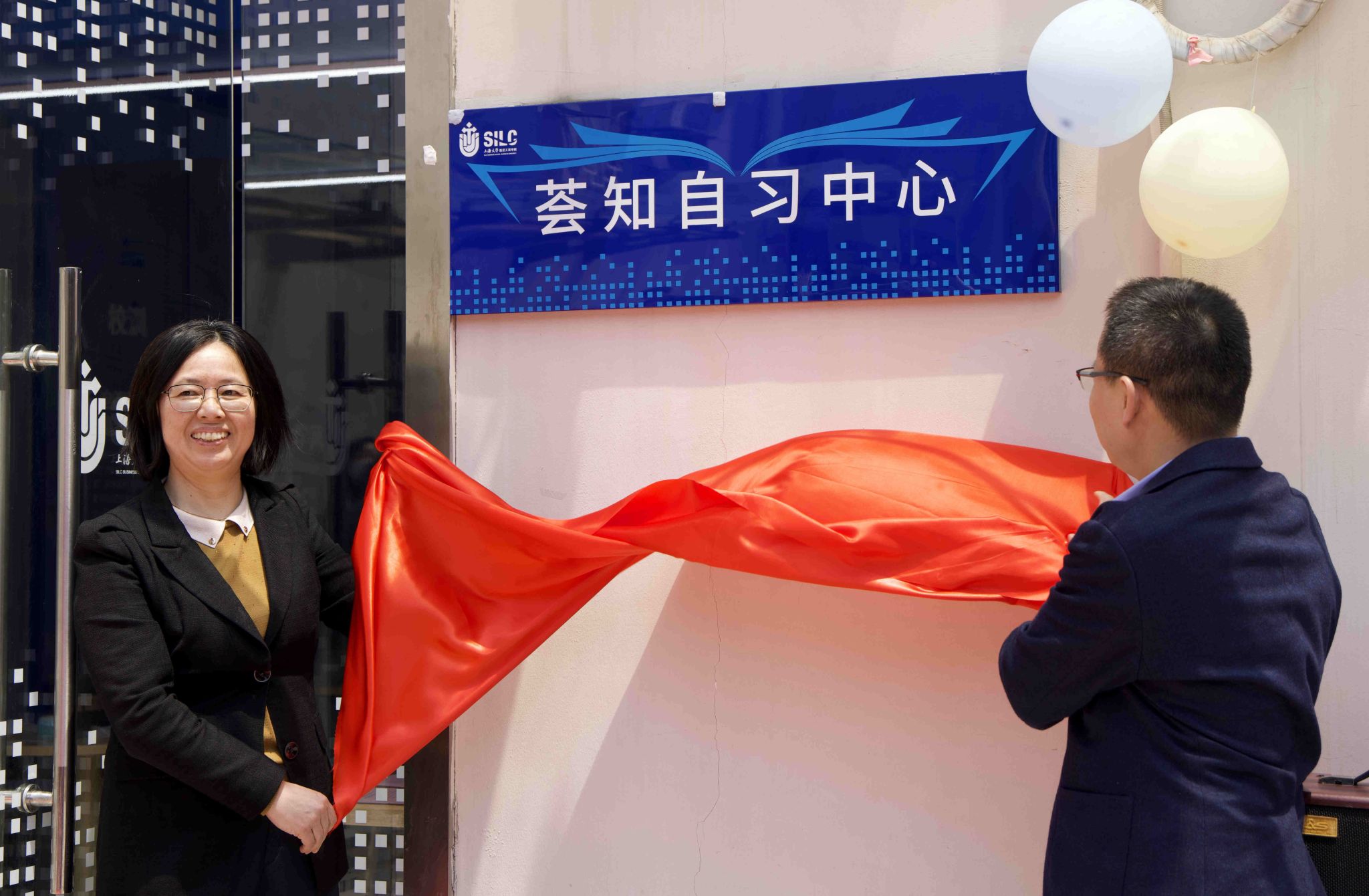 吕康娟和卞亦文共同为员工公寓荟知自习中心揭牌。
