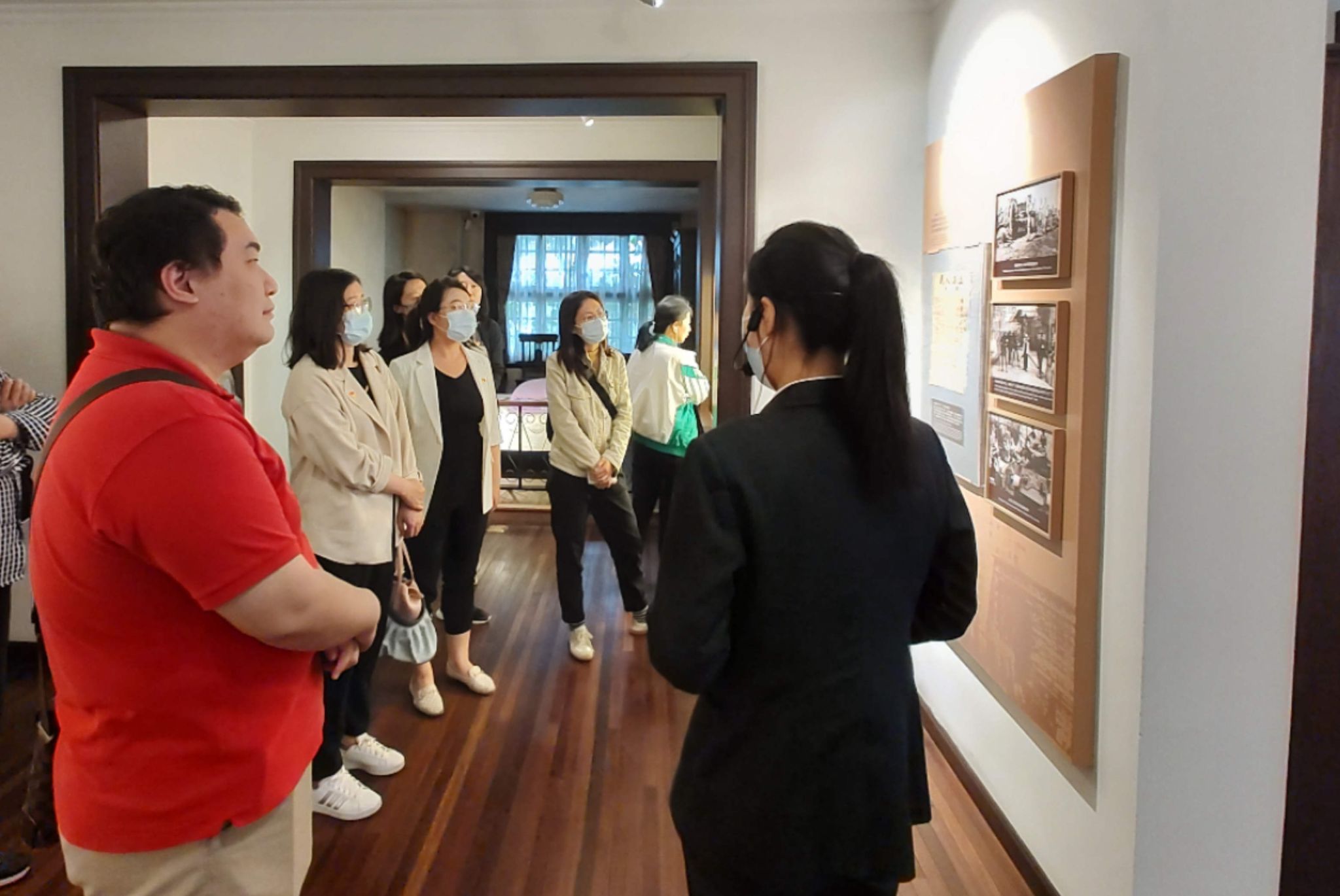 愚园路81号是一栋沿街的独栋英式小洋楼,是革命先辈刘长胜1946年至1949年在沪从事地下革命斗争的居住地、上海局的秘密机关旧址之一。陈列馆底层复原了文委筹建左联的地点公咖啡馆,二楼三楼通过数百余件实物、图片以及油画、雕塑的展陈、情景模拟、影视合成等表现手法,生动形象地展示了中共上海地下组织发展斗争的历程。看着眼前一件件革命先辈的遗物和老照片,聆听着讲解员的专业讲解,大家仿佛穿越时空,走进那段动荡不安又充满激情的岁月,切身感受到革命先辈们坚定的理想信念和舍身忘我的大无畏精神。