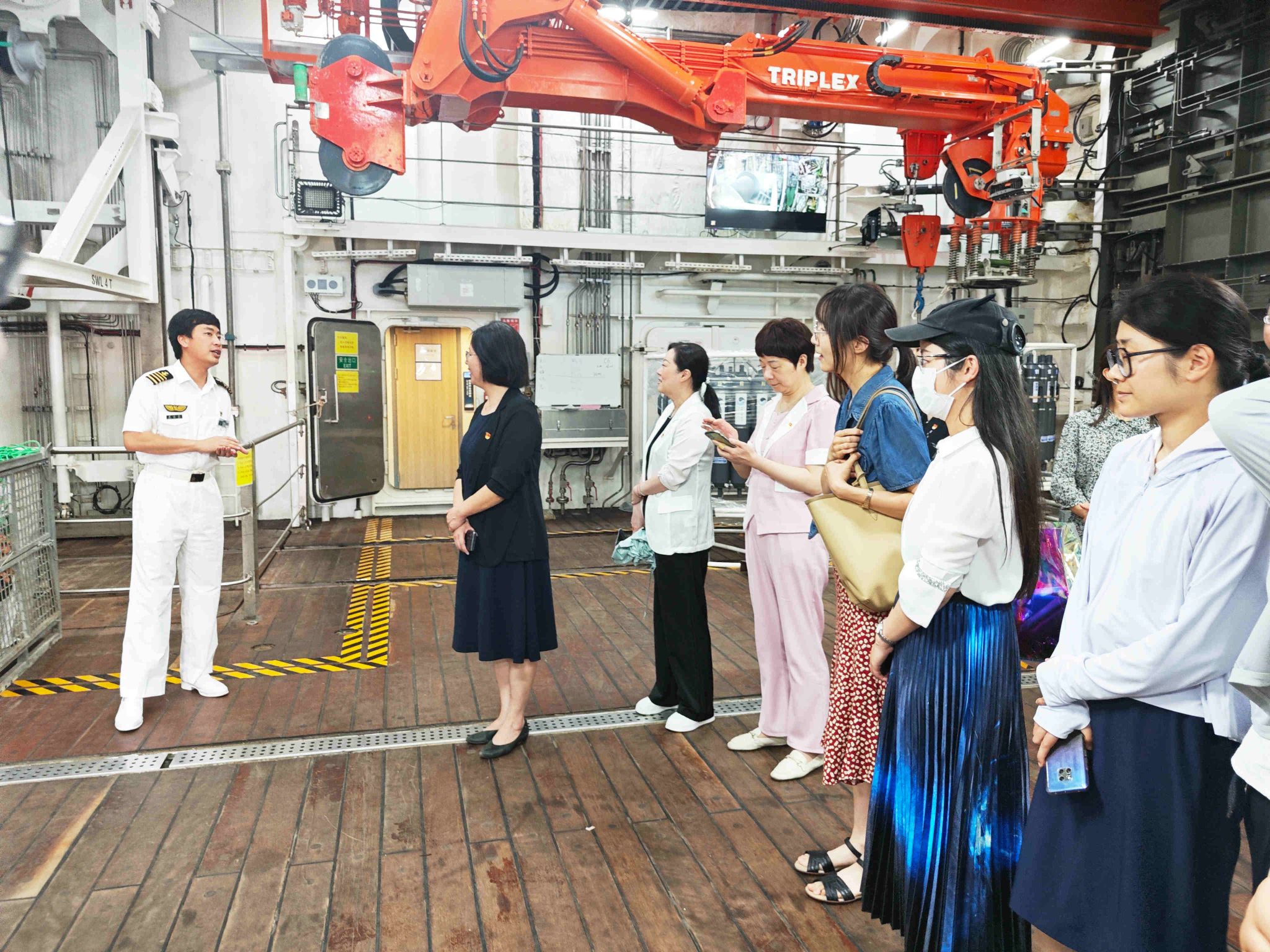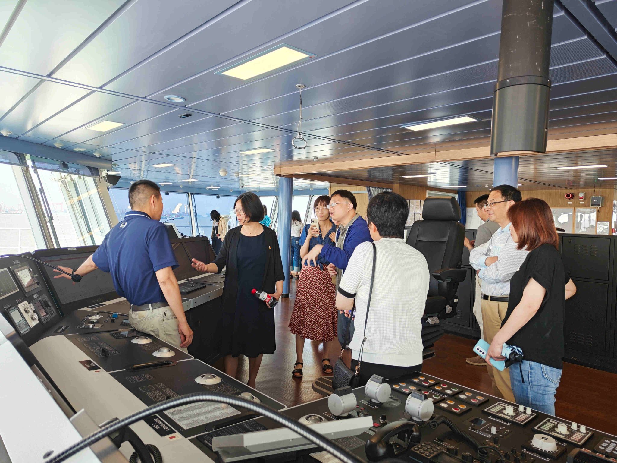 在黄嵘经理的引导下,吕康娟书记一行登上停泊在中国极地研究中心港口岸边的"雪龙2"号极地考察船,观看了讲述2022年最新一次该船南极科考进程和收获的专题纪录片,并依次参观了船上的科学实验室、会议室、餐厅、健身房、放映厅、科考专家寝室、直升机停机坪,还进入位于全船最高处九层甲板的驾驶控制室,现场聆听了关于这艘我国目前最先进的极地科考船各方面情况的详细讲解。