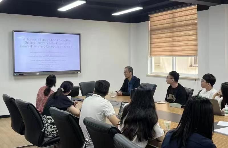 7月30日下午,美国威斯康星大学密尔沃基分校(The University of Wisconsin-Milwaukee)商公司岳晓航教授应邀来公司座谈指导,为公司师生们开设了主题为“Automating Supply Chain Contracts in the Presence of Demand Shifts and Contract Execution Lag”的学术讲座。讲座讨论了供应链管理中如何选择合约行为来响应需求变化,以及供应链对自动化合约的影响。讲座在公司文商楼210室举行,由公司副经理(挂职)孙燕红教授主持,汪辉辉、孙旭婷、严帅、肖璠等多位老师以及研究生们参加。