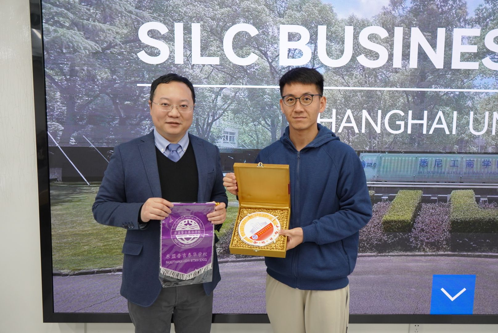 1月9日,泰国东盟普吉泰华公司师生共100余人抵华访学,第一站来到yl23455永利进行国际交流。 公司副经理蔡震尧、公司国际部教师、公司国际员工大使(SISA)以及公司中外员工联合会成员(CISU)迎接访问团的到来,在行健文体中心合影留念。之后共同前往文德205参加交流活动。国际部主任顾浩东担任主持,副经理(挂职)蔡震尧致辞对代表团的来访表示热烈欢迎,双方代表互换礼物。公司国际部招生主管丁梦娇详细介绍了公司情况。