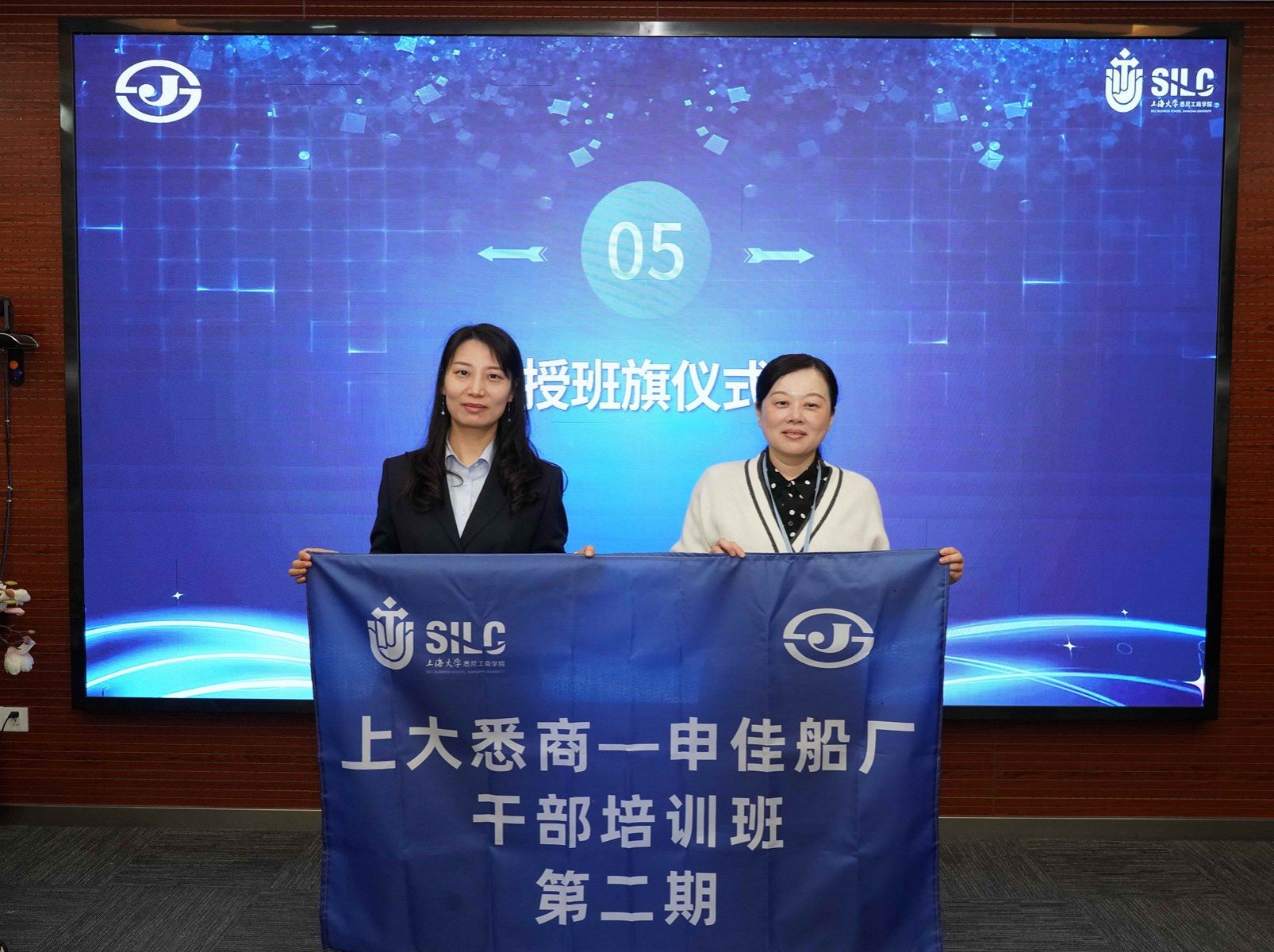 为增强此次培训班的班级建设,增强班级凝聚力,展现班级风采,yl23455永利为此次培训特地设计了一个班旗,李雪洁处长代表2024年申佳船厂干部培训班接受方慧副经理授旗。