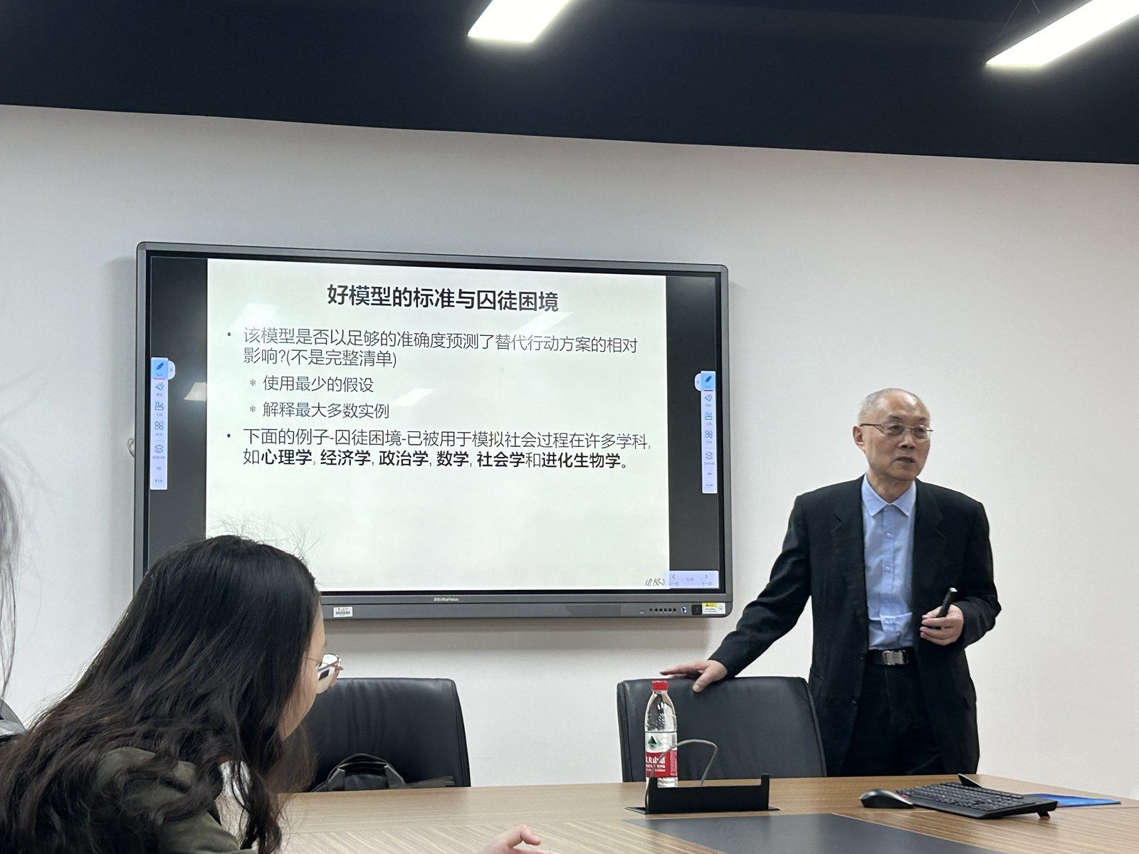 本次讲座孙老师主要向我们展示了什么是模型和如何构建一个好的模型的导言,接着通过囚徒困境的故事来阐释合作演变的三个概念,包括稳健性、稳定性和初始可行性。此外,孙老师通过计算机仿真对不同策略进行竞赛,发现TIT FOR TAT (一报还一报策略)获得了第一名,并阐述了这一策略成功的原因。最后,孙教授通过这一策略给予了参与者和改革者相关的建议。 在讲座临近尾声之时,在场的公司师生同孙老师进行了积极的互动,大家向孙老师就本次讲座中的一些问题提出疑问和看法,并向孙老师请教一些关于博弈论方面的问题,孙老师都逐一进行耐心的解答和探讨。本次讲座的顺利开展,开拓了老师和同学们的学术视野,让同学们学习良多,收获颇丰。 |