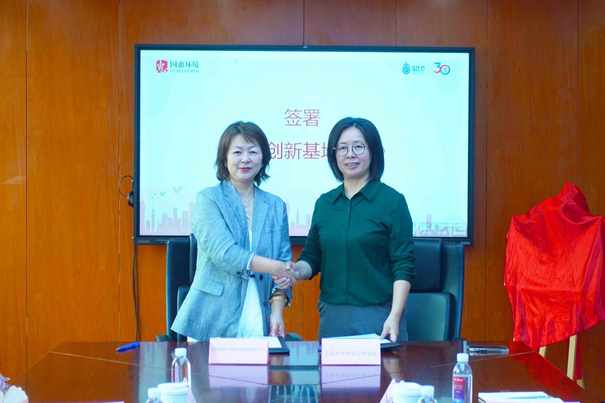 华涵和吕康娟分别代表国惠环境和悉商公司签署《协同创新基地协议》。