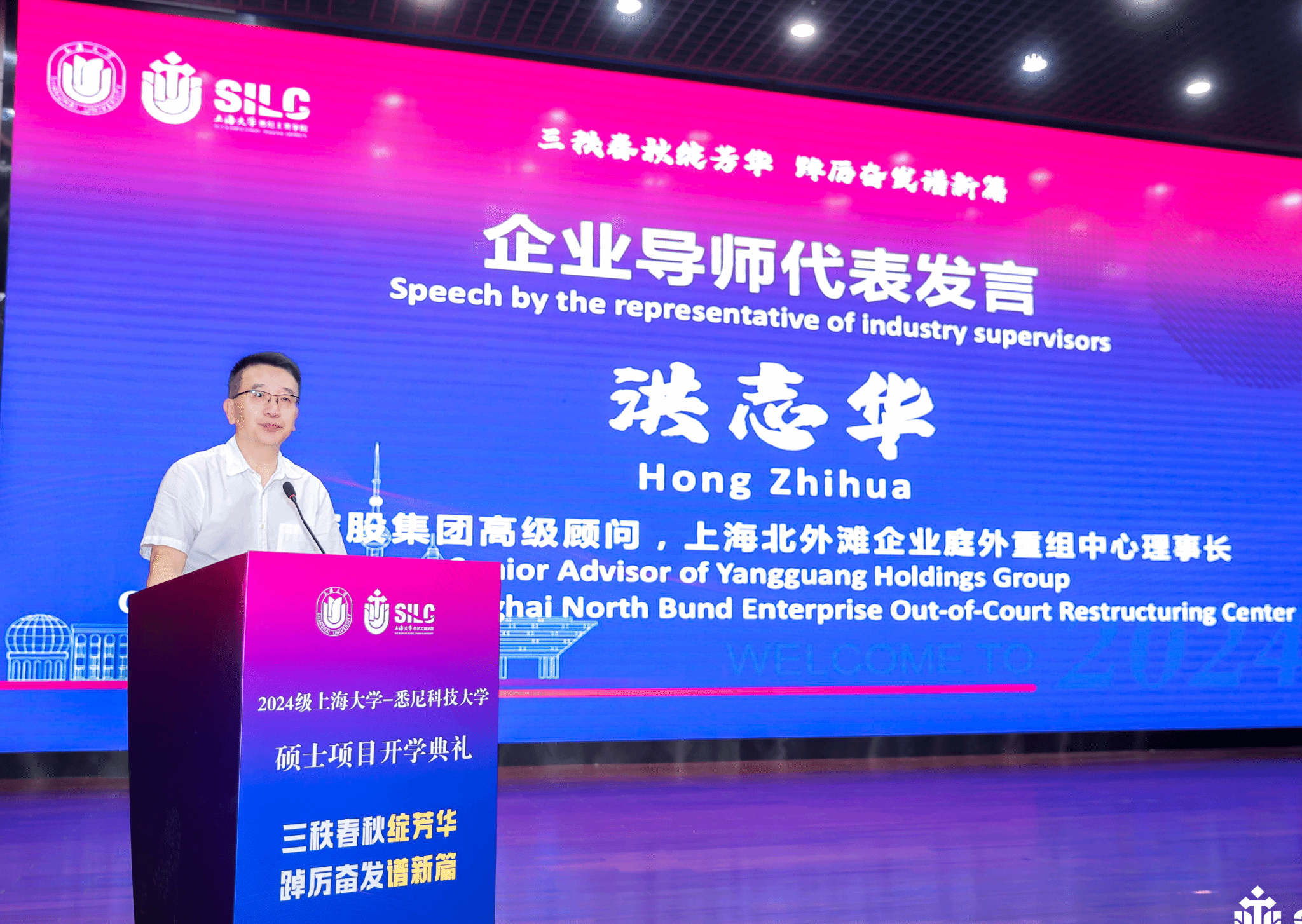 悉尼科技大学工程和信息技术公司经理Peta Wyeth教授和商公司经理Carl Rhodes教授通过视频,向新生们传达了祝福与期待,希望同学们成为创造性的问题解决者、协作沟通者和未来的领导者。 师生们共同欣赏了歌曲《You Raise Me Up》;迎新视频《金秋圆梦,共书青春》引发新生们对未来学习生活的憧憬与期待。随后,阳光控股集团高级顾问、上海北外滩企业庭外重组中心理事长洪志华作为企业导师代表发言。他从自身经历出发,鼓励同学们保持初心、勇于拥抱变化、积极承担社会责任,在悉商这片沃土上共同成长,绽放光彩。 2023级硕士研究生李明作为在校生代表,分享了学习感悟与收获,强调拓宽视野、理论与实践相结合的重要性,以及坚定信念对个人成长与事业成功的关键作用。2024级MEM专业硕士刘国峰作为新生代表发言,分享互联网行业经历,阐述了选择yl23455永利的原因,希望同学们能在研究生生涯中享受学习、共同成长、共创未来。2023级在读员工代表陶沫、胡珺妍、沈耀庭、黄鹏带来朗诵《筑梦,我们在一起》,以深情的语言、饱满的情感,激发了新生们对未来的无限向往与追求。