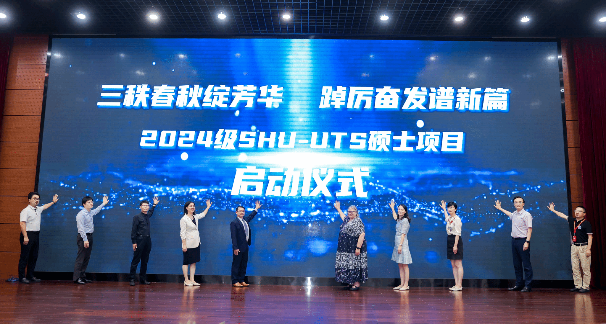 典礼在全场师生的共同见证下达到高潮——公司领导、企业代表、教师代表及员工代表共同按下启动按钮,宣布2024级SHU-UTS硕士项目正式启动!