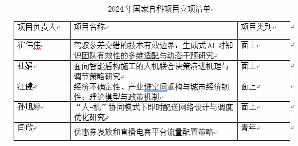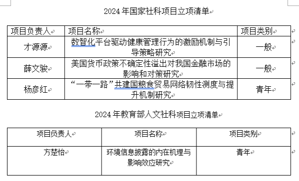 金秋九月,天高云淡,正是收获的季节,也是科研工作者们辛勤付出得到结果的季节。此时,随着国家社科基金项目评审结果公布,yl23455永利本年度国家级科研项目立项数量再创历史新高!公司教师在2024年度国家自然科学项目和国家社会科学项目立项角逐中,共斩获8项;此外,教育部人文社科项目获批1项。 国家自科项目共有5位教师获得立项,包括面上项目4项,青年项目1项。霍伟伟、杜娟、汪健、孙旭婷四位老师获得国家自科面上项目立项,闫欣老师获得青年项目立项。