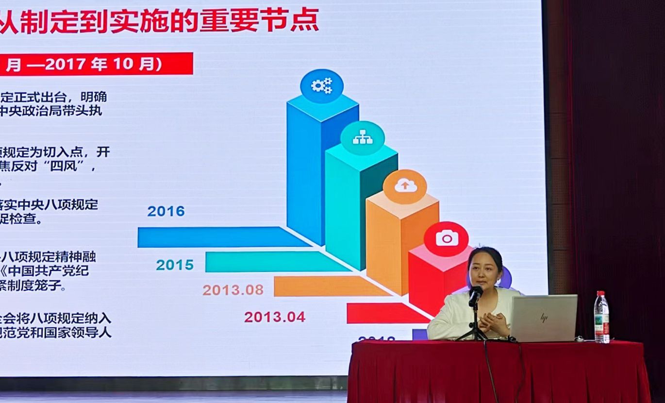 李岩以“深入贯彻中央八项规定精神 推进作风建设常态化长效化”为主题,从中央八项规定精神的出台背景、主要内容、重要意义等方面进行了深入解读。李老师结合高校实际,通过典型案例详细阐述了在教学、科研、管理等工作中贯彻落实中央八项规定精神的具体要求,强调了反对形式主义、官僚主义,杜绝违规违纪行为的重要性。讲座内容丰富,案例生动,引导师生深入思考如何在日常工作和学习中贯彻落实中央八项规定精神,使与会师生对中央八项规定精神有了更深刻的理解。