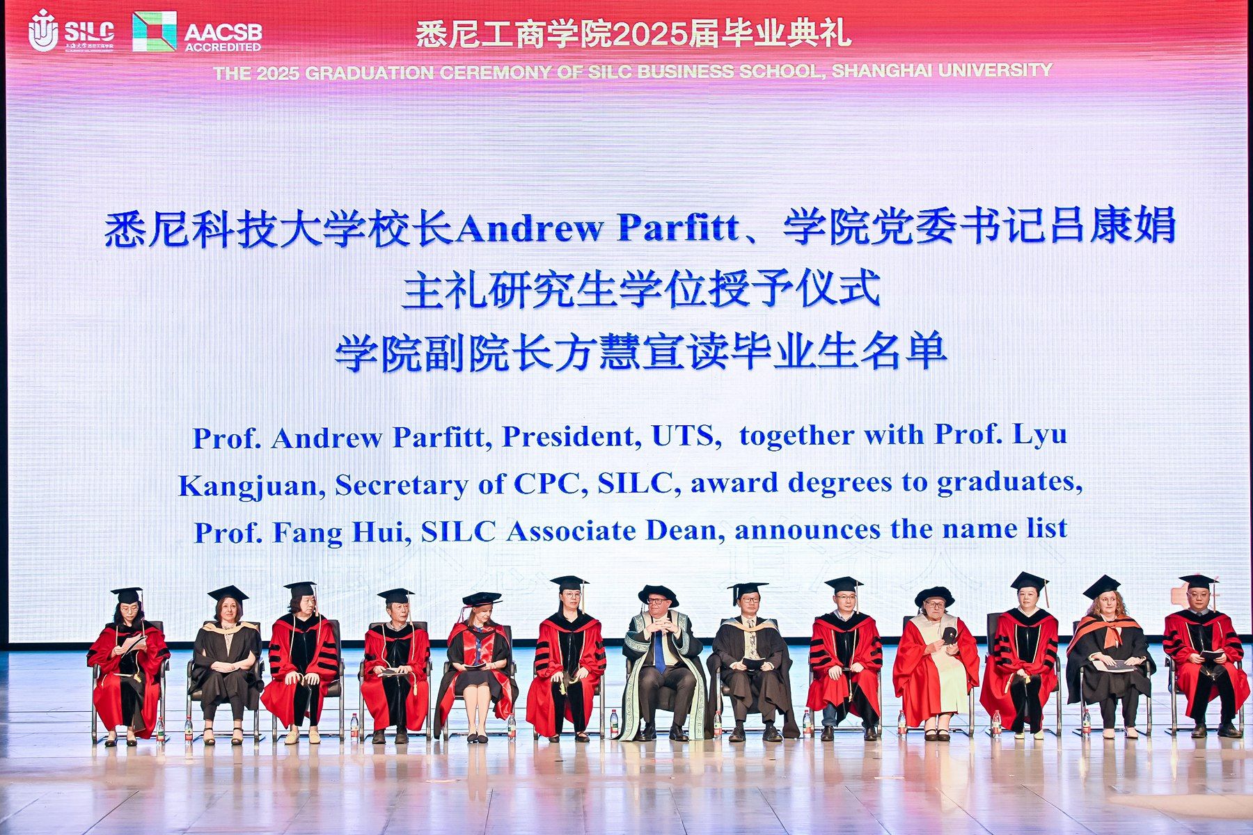 悉尼科技大学董事长Andrew Parfitt、公司党委书记吕康娟主礼研究生学位授予仪式;公司副经理方慧宣读毕业生名单。悉尼科技大学副董事长Leo Mian Liu、公司经理卞亦文主礼本科生学位授予仪式;公司副经理霍伟伟宣读毕业生名单。