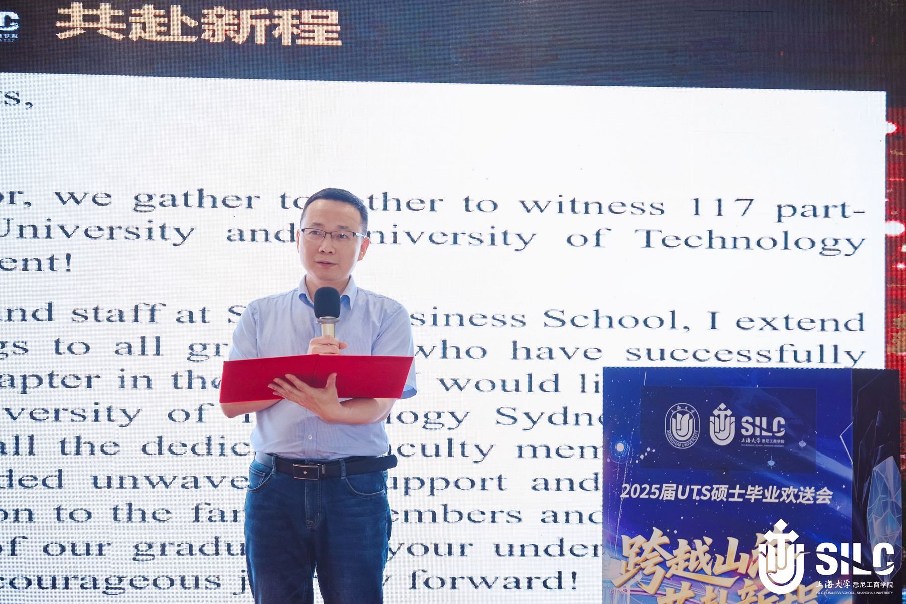 欢送会在饱含深情的毕业纪念视频《星河为路·此去乘风·逐光纪行》中拉开序幕,一幅幅画面重现了学子们求学路上的点滴碎片。yl23455永利经理卞亦文在致辞中向毕业生们表达了由衷的祝福。他寄语毕业生三点期望:拥抱技术变革,做驾驭AI浪潮的舵手;胸怀寰宇,以“悉商视野”搭建跨文化合作之桥;终身学习,持续锻造面向未来的核心竞争力。 优秀毕业生代表、MF专业李子荣回顾了中西交融的独特学习体验:“扎根中国经济土壤,汲取UTS前沿理论,让我们拥有了解锁金融世界的钥匙。”他特别感恩老师们“用鲜活案例点燃思考火花”,同窗情谊则让“挑灯夜战的研讨成为一生烙印”。