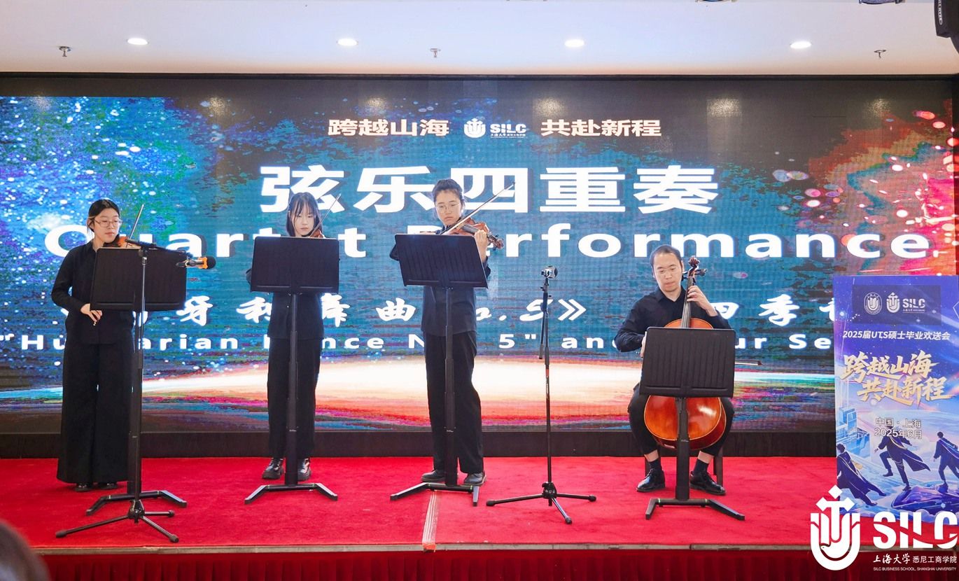 典礼洋溢着青春的艺术气息,毕业生集体朗诵原创诗歌《谢谢你》,字句饱含对师友的深情;2024级MEM马文杰弹唱歌曲《边角料》,致敬平凡时光里的不凡坚持;弦乐四重奏《匈牙利舞曲No.5》 《四季调》的激扬旋律,将全场气氛推向高潮。 同学们满载知识与祝福,正式踏上人生新征途。祝愿所有毕业生们以全球视野与创新能力,于时代风浪中校准航向,在广阔星空下拓土开疆,继续书写“跨越山海”的壮丽篇章。 |