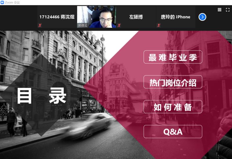 紧接着,由特邀嘉宾Thomas Wu带来具有针对性与前瞻性的就业指导——“疫情期间,校招如何应对”。Thomas有着丰富经管类职业经验、供职多家知名金融、财务机构的Thomas 他主要从最难毕业季、热门岗位介绍、如何准备、师生问答四个方面,对就业形势、行业特点、面试应对等进行分析。最后也有同学积极与Thomas互动问答,解决了专业性疑难,之于人生规划也有了新的认识与见解。同学们更加明晰未来的发展道路、善识善用校内校外就业资源。