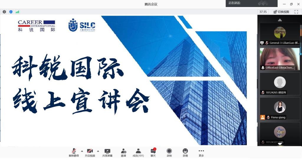 2020年9月18日下午2点,科锐国际线上宣讲会活动如期举行,本次活动采用线上视频会议形式,让同学们近距离参与到校企宣讲会中,吸引了103名员工参与。通过企业展示人员的分享,同学们对于科锐国际公司的合作人才培养模式、未来职业发展方向规划等方面都有了更加深入的了解。此次宣讲会由科锐国际招聘团队的Olivia Chen主讲,同时Lilian Guo和Fiona Qiang 就公司人才培养机制等方面进行了补充。