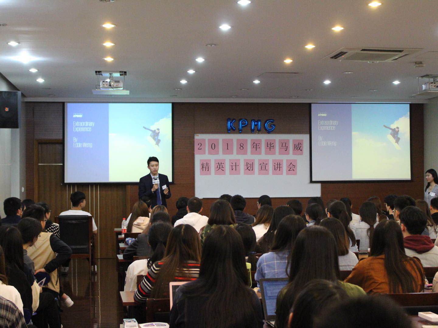 2018年4月9日18:00,毕马威精英计划校园宣讲会在文德三楼报告厅举行,吸引了来自悉商、其他公司以及外校的150多位优秀的员工。本场毕马威精英计划宣讲会分为5个环节由人力资源部门的Joyce Cai和April Yu开场,详细介绍了精英计划的项目内容,接着毕马威审计部门Eddie Weng分享了他在KPMG工作的感受和体验,之后精英计划的成员Cathy Tang和Dennis Yan分享他们在精英计划的成长,Q&A环节合伙人Eddie Weng、招聘经理Johnny Wang以及毕马威的出席成员一起回答了同学们的疑惑。