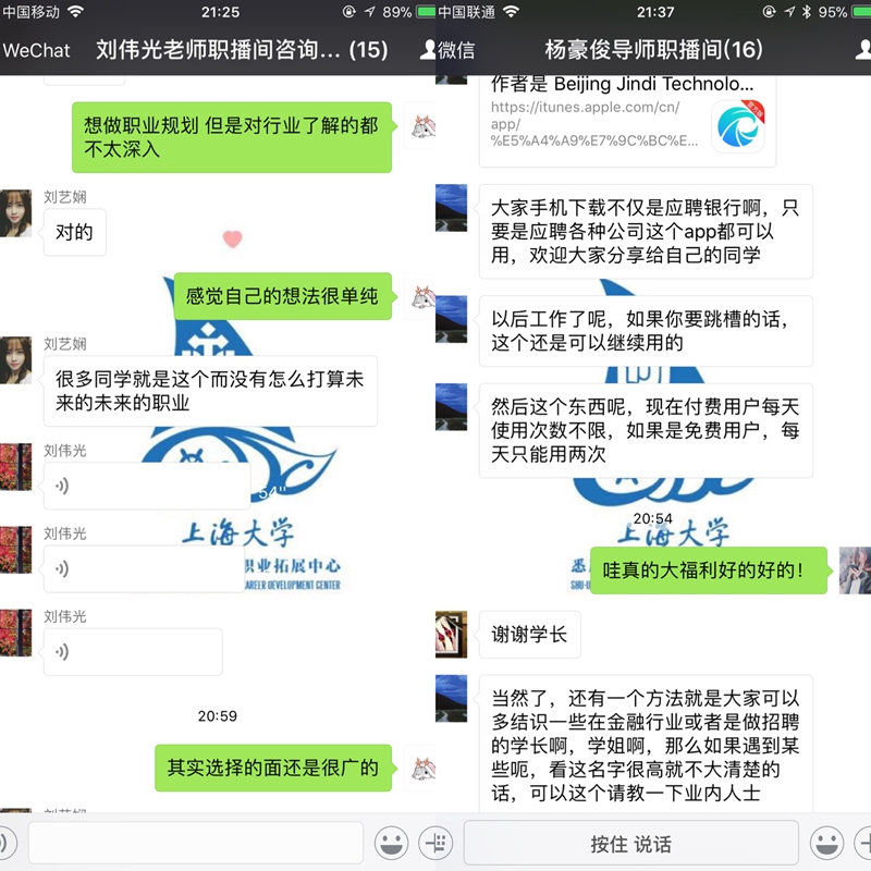 2018年01月26日晚8点整,第九次职播间以线上讲座如约举行。本次活动邀请了两位来自“财务”和“银行”行业的导师,他们分别是上海儒竞电子科技有限公司的副总裁兼CFO刘伟光老师以及浦发银行陆家嘴支行的理财经理杨豪俊老师。他们从行业内容、行业储备、行业发展趋势等多个方面提供了自己独到的见解,并结合自身经历为29名有相关意愿的同学进行线上的答疑解惑。在一小时的积极问答中,同学们加深了对于行业的了解和认识。