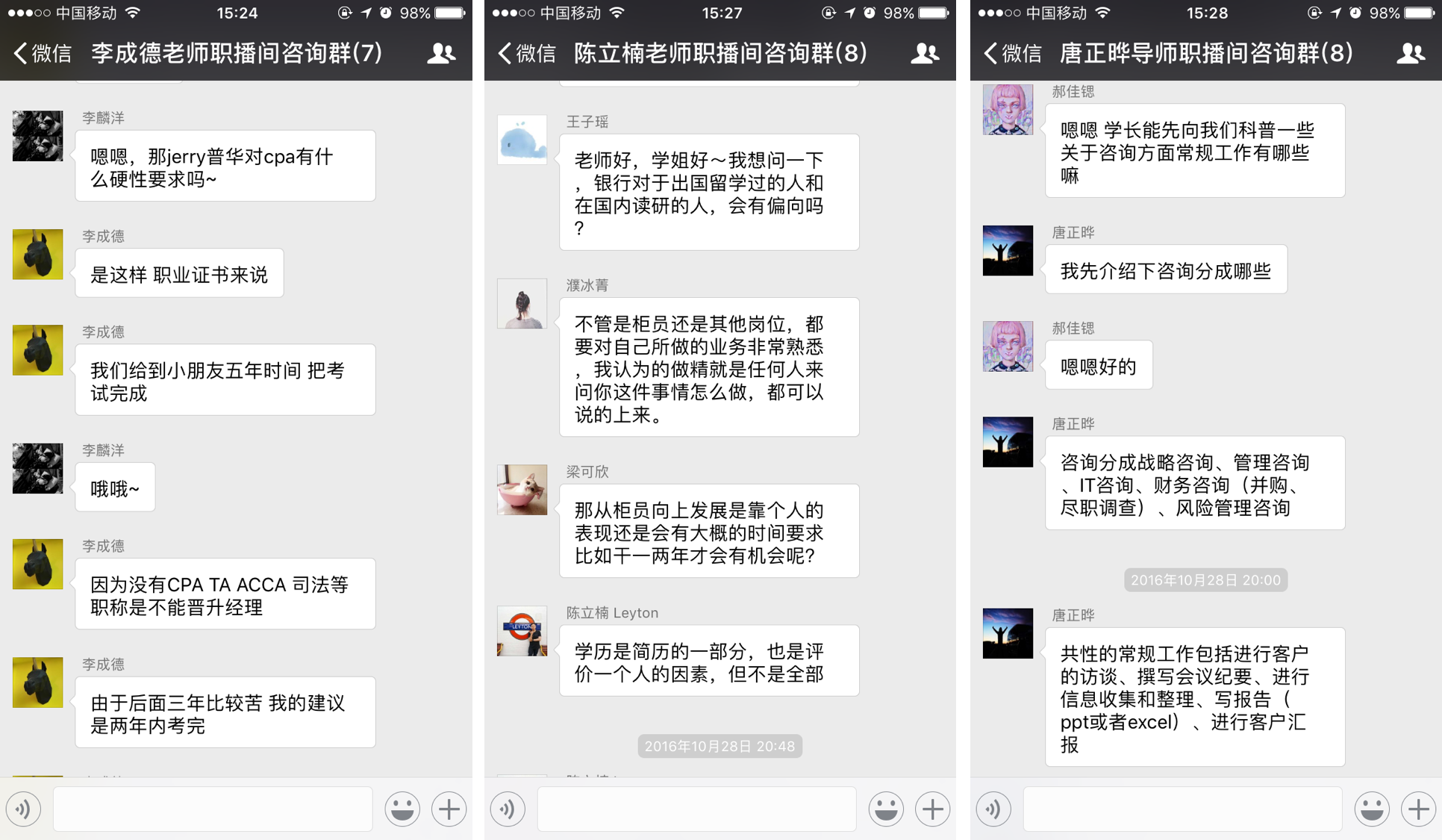 2016年10月28日晚上8点整,本次职业导航月的特色线上交流活动——“职播间”准时在微信平台上进行。这次活动特别邀请了三位分别来自咨询、银行和税务行业的员工,他们分别是科尔尼咨询项目经理唐正晔员工,南洋商业银行上海徐汇支行行长陈立楠员工和普华永道税务咨询高级经理李成德员工。活动一经推出就受到了同学们广泛的参与,许多同学纷纷报名,最终共有17位同学参与了本次职播间的活动。本次活动按照行业类型分为咨询、银行和税务三个模块,主要是通过线上员工提问,员工答疑解惑并提供建议的方式进行。