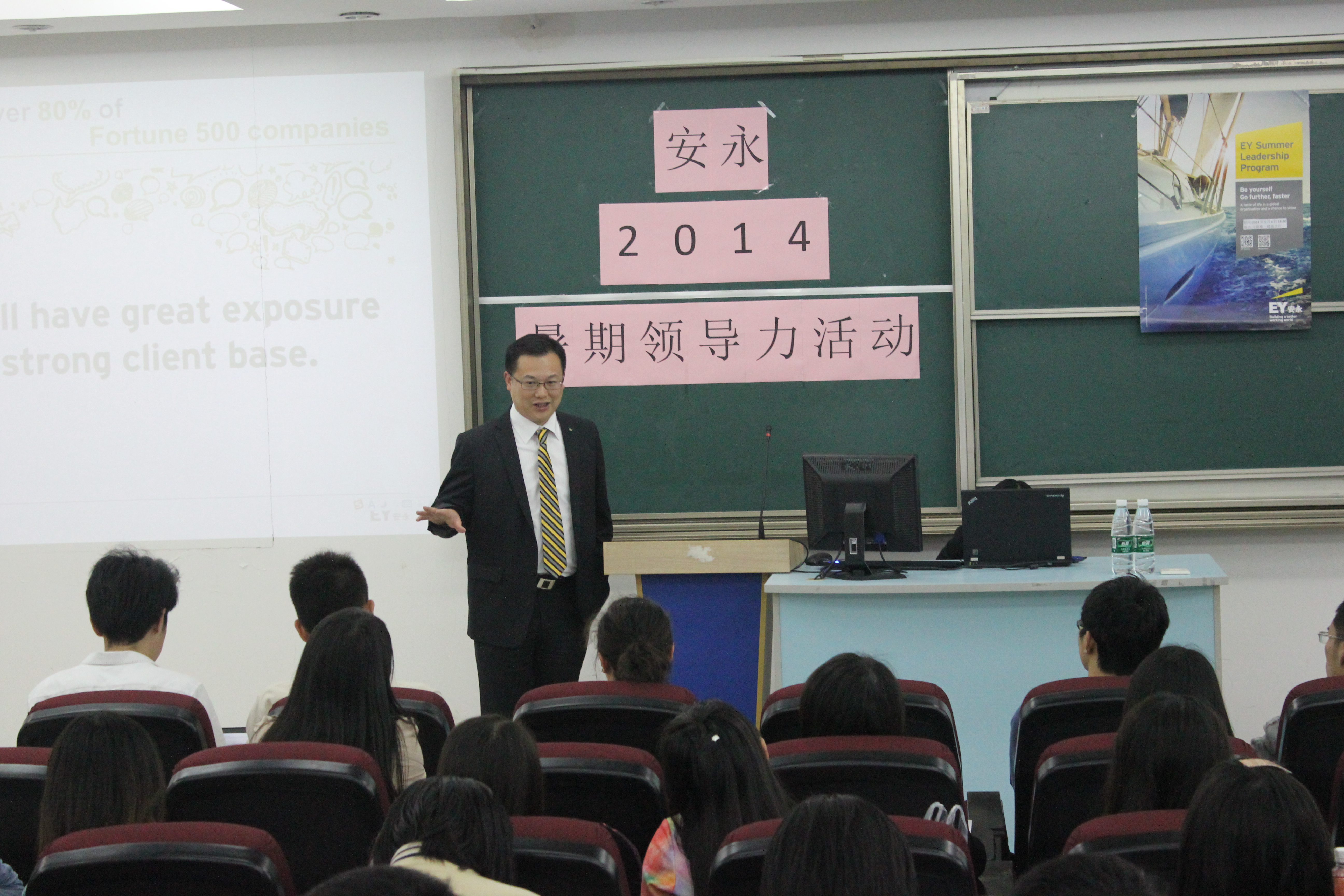 2014年5月6日晚上18点30分,傍晚的夕阳将嘉定校区蒙上了一层红色的光晕,此时在文德楼1楼报告厅里,一项活动也在热闹的气氛中进行——2014年安永暑期领导力活动(SLP)宣讲会。本次宣讲会得到了安永会计师事务所的极度重视,当日到场了三位合伙人。并包含了多项内容:安永事务所介绍、合伙人经验分享、模拟面试、SLP活动疑问解答。