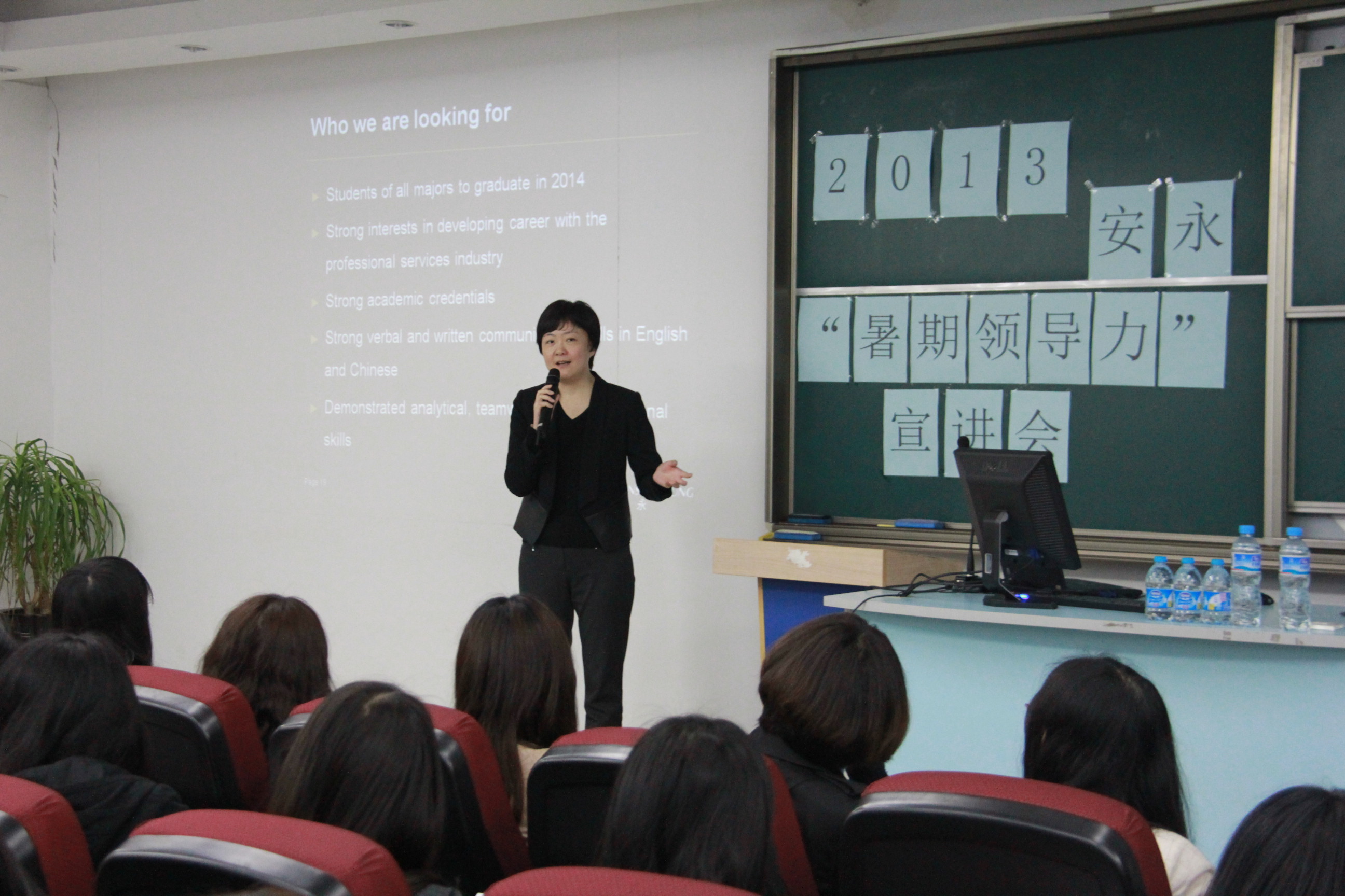 2013年4月24日星期三晚18: 30,在yl23455永利嘉定校区文德楼一楼报告厅,yl23455永利实习就业指导中心举办了安永"暑期领导力"宣讲会。宣讲会由安永主办方精心准备,并由安永的审计合伙人朱蕾女士、安永税务部经理、HR部门的工作人员以及从"暑期领导力"中收益颇多的现任安永职员一起为上大学子带来以"坚持自我"为主题关于"暑期领导力"讲解。此外,此次宣讲会别出心裁的预约设计,为热情参加暑期领导力活动的同学提供机会和保障。