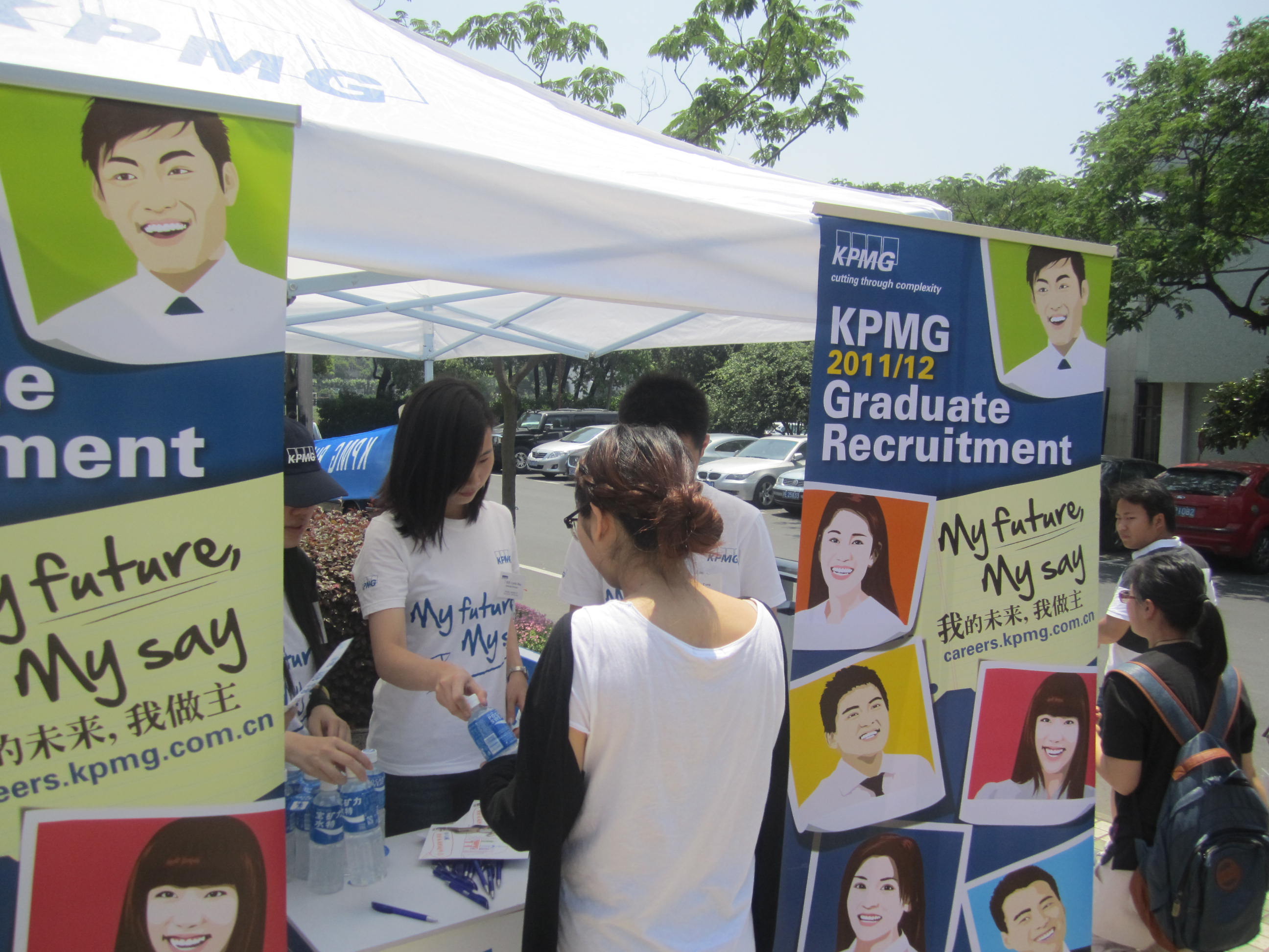 17日上午10点45分,KPMG 与宝特利水特联手早早在一食堂门口搭建了展台。包括Grace、Jerry在内的悉商员工,及其他KPMG同仁也都来到了嘉定校区进行员工回访。活动现场气氛十分热烈,同学们对KPMG有很大的兴趣,并纷纷留下了自己的基本信息。KPMG的工作人员也耐心解答同学的关于四大的各种问题,KPMG还为同学们准备了精美礼品。公司常务副经理张能辉老师、实习就业指导中心曹英老师、曾晓琳老师等也都莅临现场,与KPMG员工进行了沟通交流。