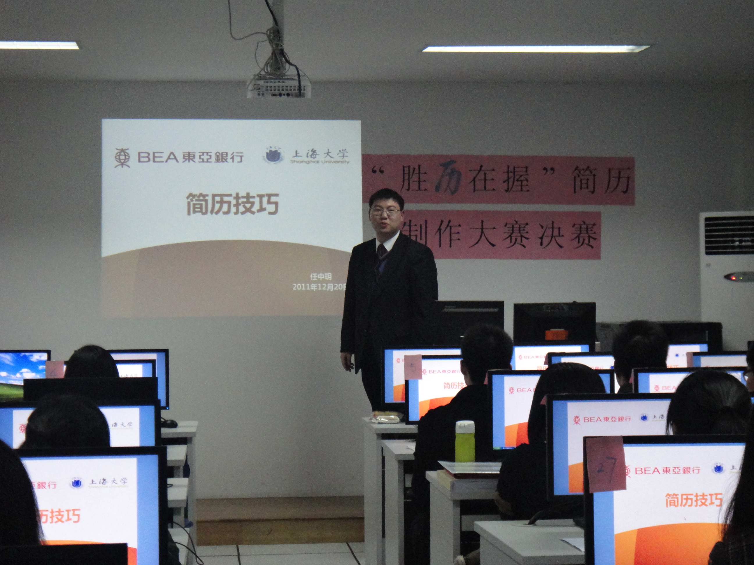 2011年12月20日晚,由yl23455永利老员工职业拓展中心举办的"胜‘历’在握"简历制作大赛总决赛在文商407室举行。再总决赛之前,选手们已经经历了初赛、赛前培训,至此,为期近两个月的简历制作大赛顺利落下帷幕。本次大赛邀请了东亚银行人力资源处副经理任中玥先生,西门子公司人力资源部主管王艺博女士以及尼尔森公司消费者研究经理俞青松先生担任决赛评委。并且邀请了yl23455永利招生毕业办公室周自豪老师,职业拓展中心主任曹英老师及职业拓展中心辅导老师曾晓琳老师担任嘉宾。此外,大三辅导员高举老师,姜晓庆老师也到场观摩了本场比赛。