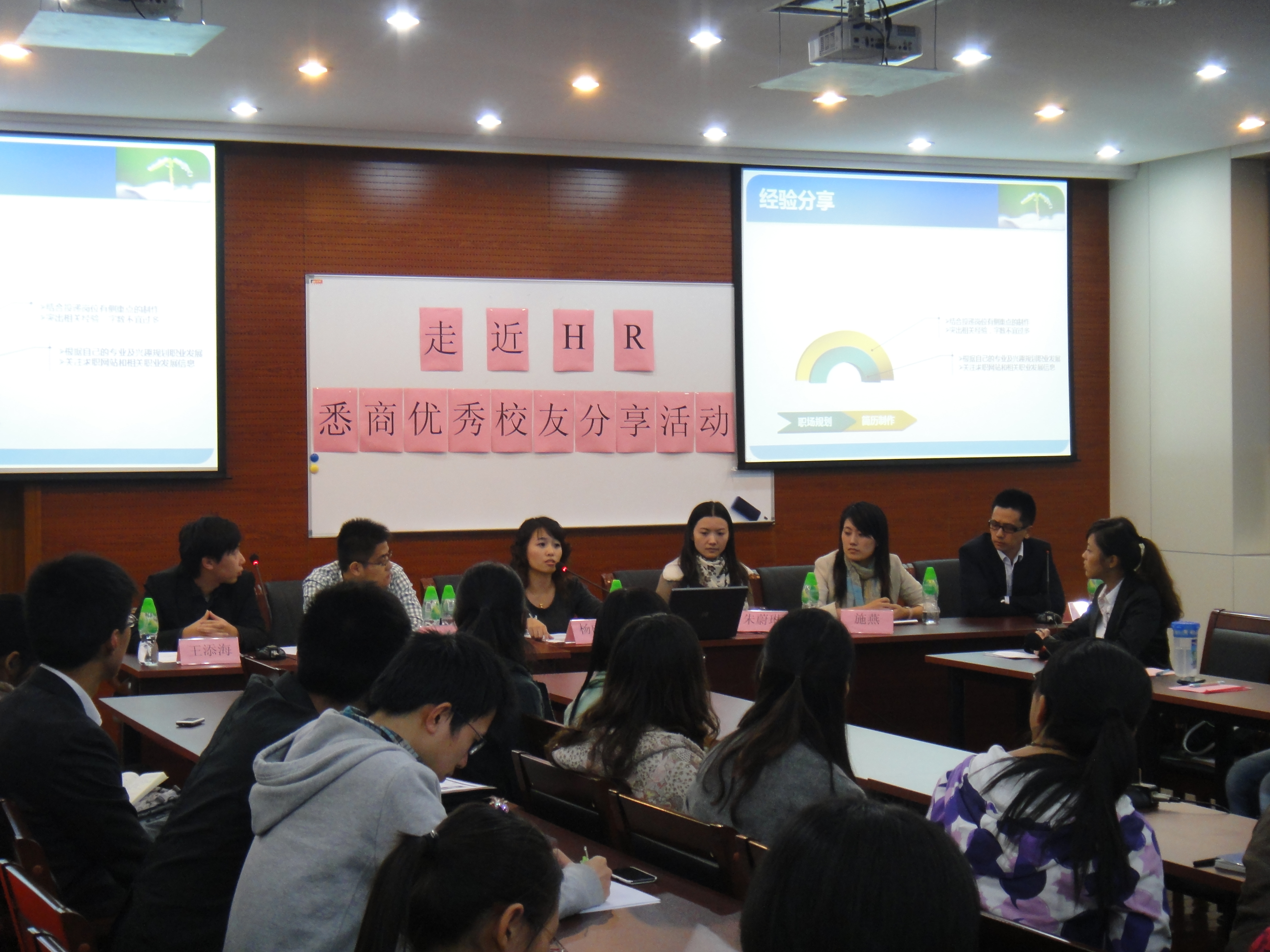 2011年10月26日晚,"走近HR——悉商优秀员工分享活动"在文德楼三楼的多功能报告厅成功举行。本次活动由悉商员工会和老员工职业拓展中心共同策划,邀请了六位来自不同公司HR部门的员工,沙文生企业管理有限公司的王添海,东方证券的何力立,日本邮船的施燕,上海建发酒业有限公司的宋之光,宝钢发展有限公司的朱蔚琳以及上海东方希杰商务有限公司的杨丽萍,与同学们一起分享面试的经验以及制作简历的技巧。