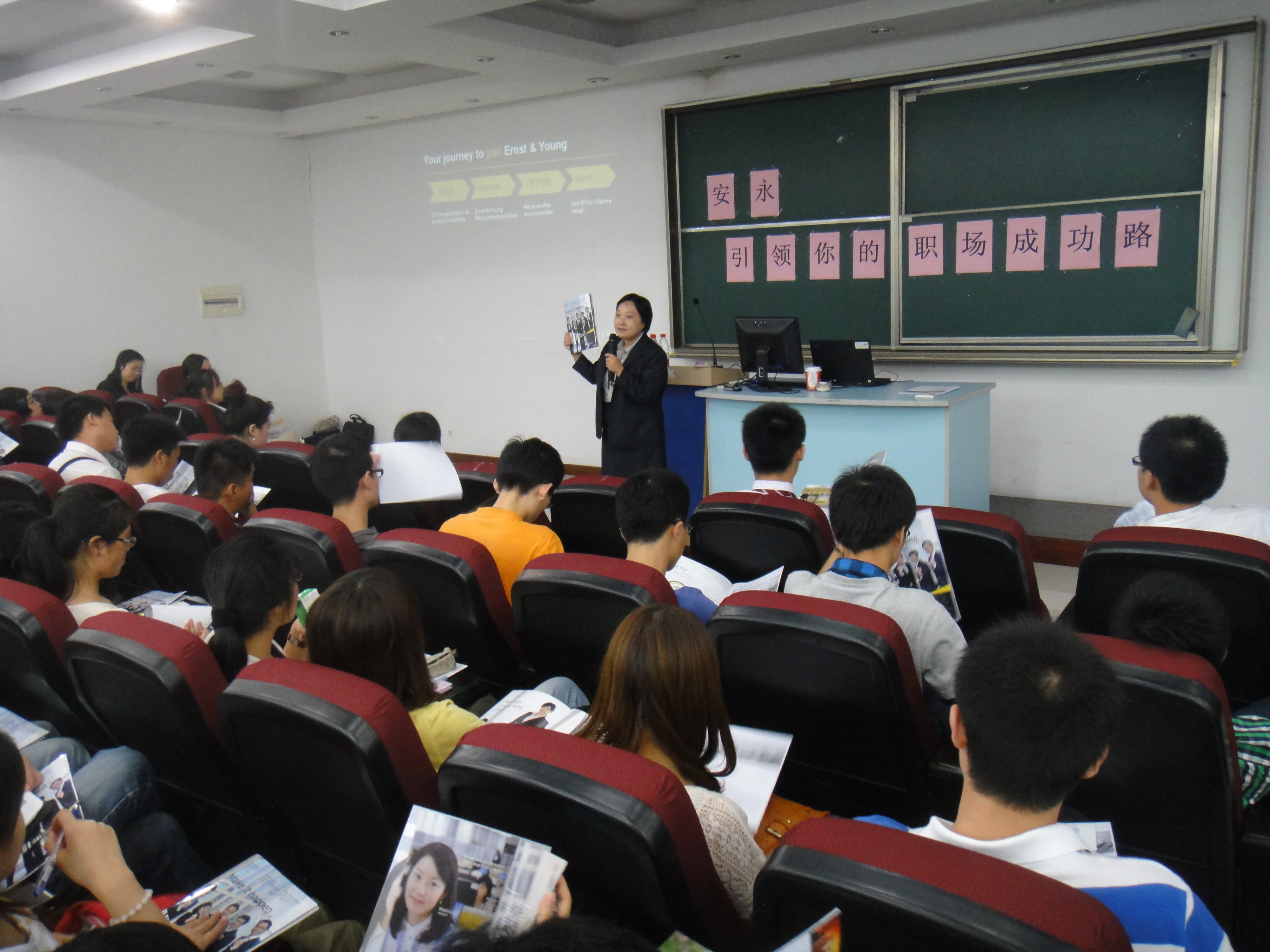 安永201秋季校园招聘宣讲会于2011年9月27日晚六点在嘉定校区yl23455永利实验楼报告厅隆重举行,安永华中区审计合伙人陈露女士和安永人力资源经理Mini女士为到场的员工带来了一场非常精彩的讲座。本次活动现场座无虚席,参与活动的150名员工除了来自悉商、管院等商科类公司,更有不乏高分子、数学系的员工,现场气氛异常热烈。