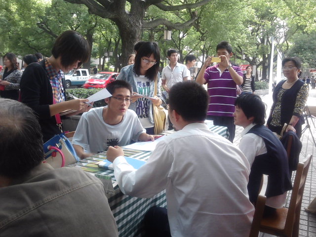 2011年9月22日下午,在嘉定清河路工人影剧院前,举办了由嘉定镇街道劳动保障事务所组织的"创业、梦想、成材"嘉定镇街道老员工创业服务现场咨询会,公司职业拓展中心员工刘帆、孙元元、任东琳、王梦媛等前往现场进行相关咨询。