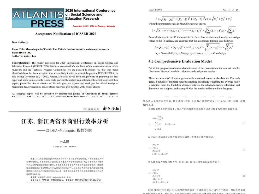 躬行实践,在各类竞赛中强化能力 林之蔚服膺“纸上得来终觉浅,绝知此事要躬行”,经常参加各种赛事,在实践中强化能力,在团队中锻炼自己。她曾作为主谈判参加了全国商业精英挑战赛,组队参与了美国老员工数学建模竞赛,在团队遇到挫折与困难时,她鼓励大家共同奋斗,最终都获得了好成绩。林之蔚说:“只有在实践中运用能力,才能清楚地认识自己;只有在团队中相互协作,才能实现共同的目标。” 比赛中对于知识的应用与实践对于她未来的学术科研之路具有很大的帮助,让她领悟到团队合作的重要性。而志同道合、并肩作战的队友更是她珍视铭记的宝贵财富。